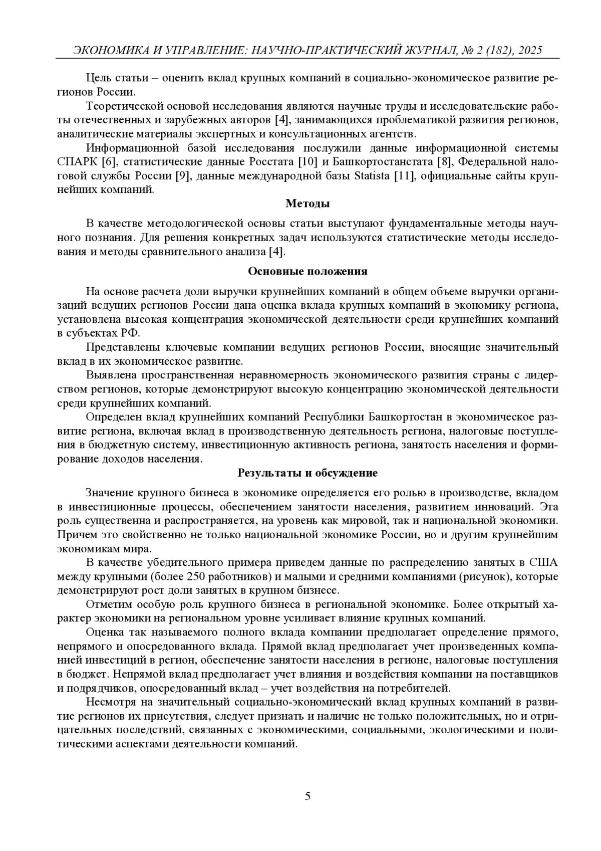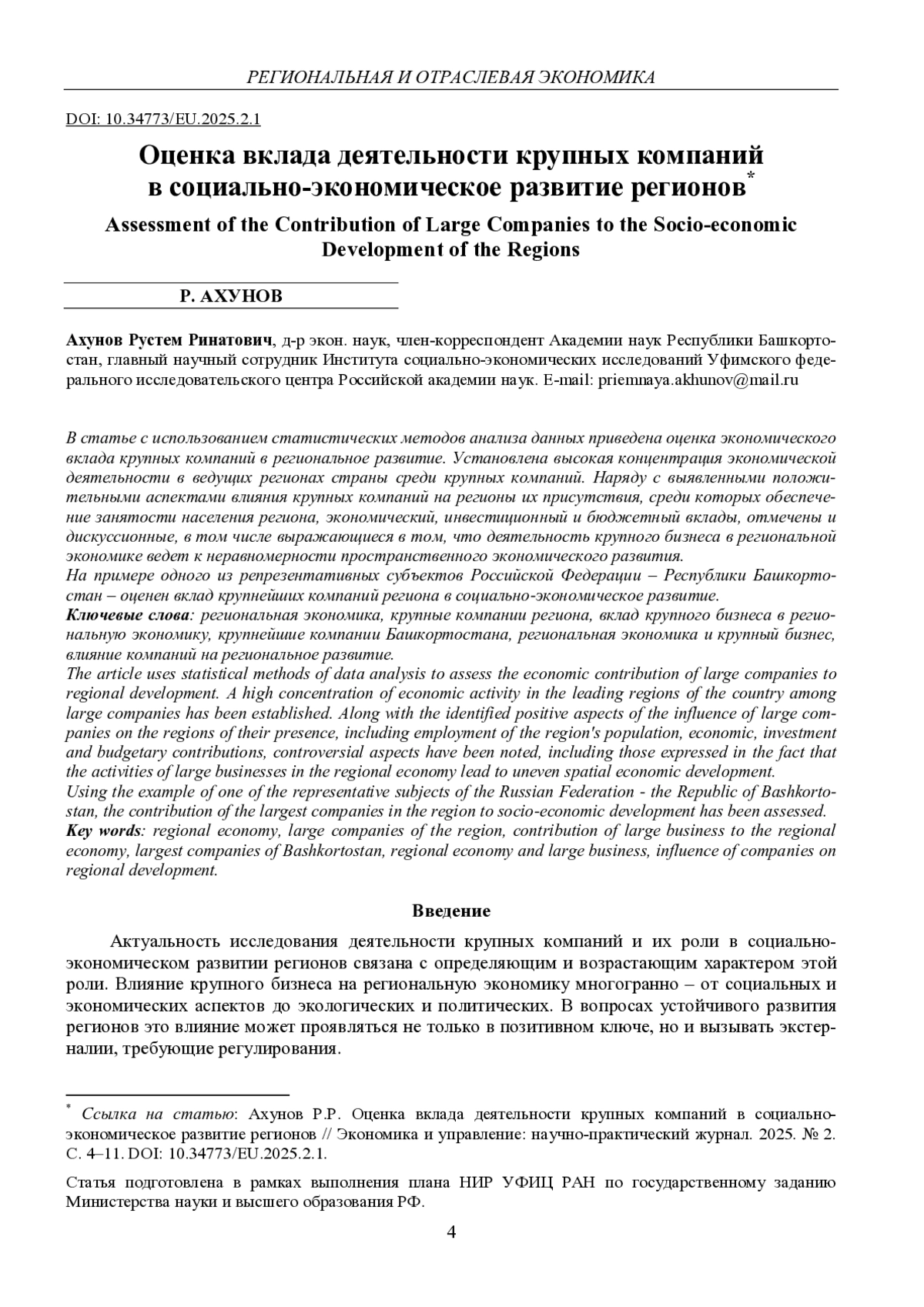 В статье с использованием статистических методов анализа данных приведена оценка экономического вклада крупных компаний в региональное развитие. Установлена высокая концентрация экономической деятельности в ведущих регионах страны среди крупных компаний. Наряду с выявленными положительными аспектами влияния крупных компаний на регионы их присутствия, среди которых обеспечение занятости населения региона, экономический, инвестиционный и бюджетный вклады, отмечены и дискуссионные, в том числе выражающиеся в том, что деятельность крупного бизнеса в региональной экономике ведет к неравномерности пространственного экономического развития. На примере одного из репрезентативных субъектов Российской Федерации – Республики Башкортостан – оценен вклад крупнейших компаний региона в социально-экономическое развитие