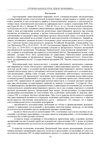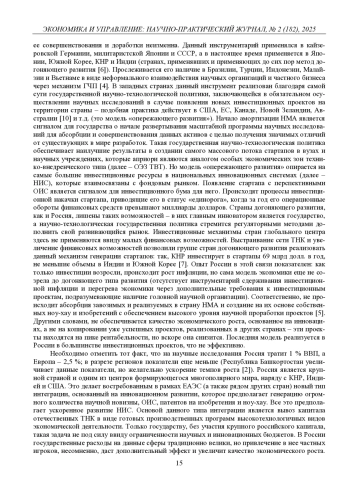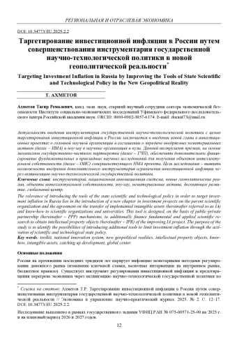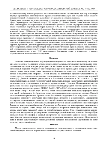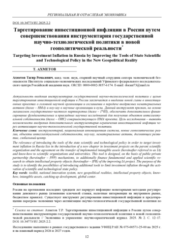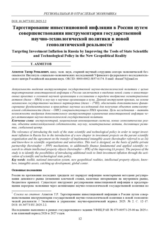 Актуальность введения инструментария государственной научно-технологической политики с целью таргетирования инвестиционной инфляции в России заключается в введении новой главы в инвестиционных проектах о головной научной организации и соглашении о передаче внедряемых нематериальных активов (далее – НМА) и ноу-хау в научные организации и вузы. Данный инструмент призван, на основе механизмов государственно-частного партнерства (далее – ГЧП), обеспечить дополнительное финансирование фундаментальных и прикладных научных исследований для получения объектов интеллектуальной собственности (далее – ОИС) совершенствующего НМА проекта. Цель исследования – выявить возможности внедрения дополнительного инструментария ограничения инвестиционной инфляции через активизацию научно-технологической государственной политики
