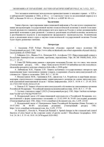2. 	Гайнанов Д.А., Иванов П.А., Печаткин В.В., Алтуфьева Т.Ю. Инвестиционный климат в Республике Башкортостан: состояние, проблемы, перспективы. Уфа: ИСЭИ УФИЦ РАН, 2024. 21 с. C. 10-15.  EDN: EZQVCE