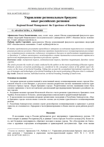 АФАНАСЬЕВА О. В., РЫБКИН А. С. УПРАВЛЕНИЕ РЕГИОНАЛЬНЫМ БРЕНДОМ: ОПЫТ РОССИЙСКИХ РЕГИОНОВ // ЭКОНОМИКА И УПРАВЛЕНИЕ: НАУЧНО-ПРАКТИЧЕСКИЙ ЖУРНАЛ. 2025. № 2 (182)
