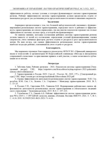 5. 	Улумбекова Г.Э., Гиноян А.Б. Рейтинг эффективности систем здравоохранения регионов РФ в 2019 г. // ОРГЗДРАВ: новости, мнения, обучения. Вестник ВШОУЗ. 2021. Т. 7, № 1. С. 4-16. DOI: 10.33029/2411-8621-2021-7-1-4-16 EDN: VOXYHH