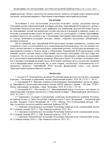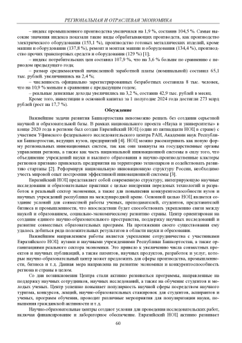 В статье отмечается, что Республика Башкортостан занимает лидирующие позиции по рейтингу социально-экономического положения субъектов. Установлено, что по итогам 2024 года регион занял 10-е место (63,64 балла) в рейтинге регионов Российской Федерации. Для повышения качества жизни населения и увеличения его доходов в целом особое внимание уделяется Евразийскому научнообразовательному центру (далее – Евразийский НОЦ) мирового уровня как драйверу развития и финансирования научно-технологического развития Республики Башкортостан. Миссия Евразийского НОЦ заключается в содействии достижению Республикой Башкортостан предпринимательского и научнотехнологического превосходства на федеральном уровне, а также реализации высокопродуктивных технологических решений на евразийском пространстве