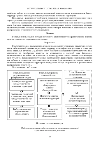 В статье обосновано, что в условиях межрегиональной дифференциации и ограниченного объема средств возрастает необходимость их рационального аккумулирования и распределения, поддержки реального сектора национальной экономики и внедрения механизмов повышения самодостаточности территории. Аргументировано, что одним из инструментов финансово-инвестиционного обеспечения потребностей и повышения самодостаточности экономики территории выступают институты развития. Разработана модель повышения самодостаточности региона с участием институтов развития. Предложены мероприятия по повышению самодостаточности территории