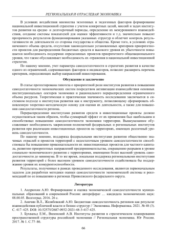 1. 	Андрюхин А.Ю. Формирование и оценка экономической самодостаточности муниципальных образований в современной России: автореферат … кандидата экономических наук: 08.00.05. Волгоград. 2016. 26 с.  EDN: ZQBAVB