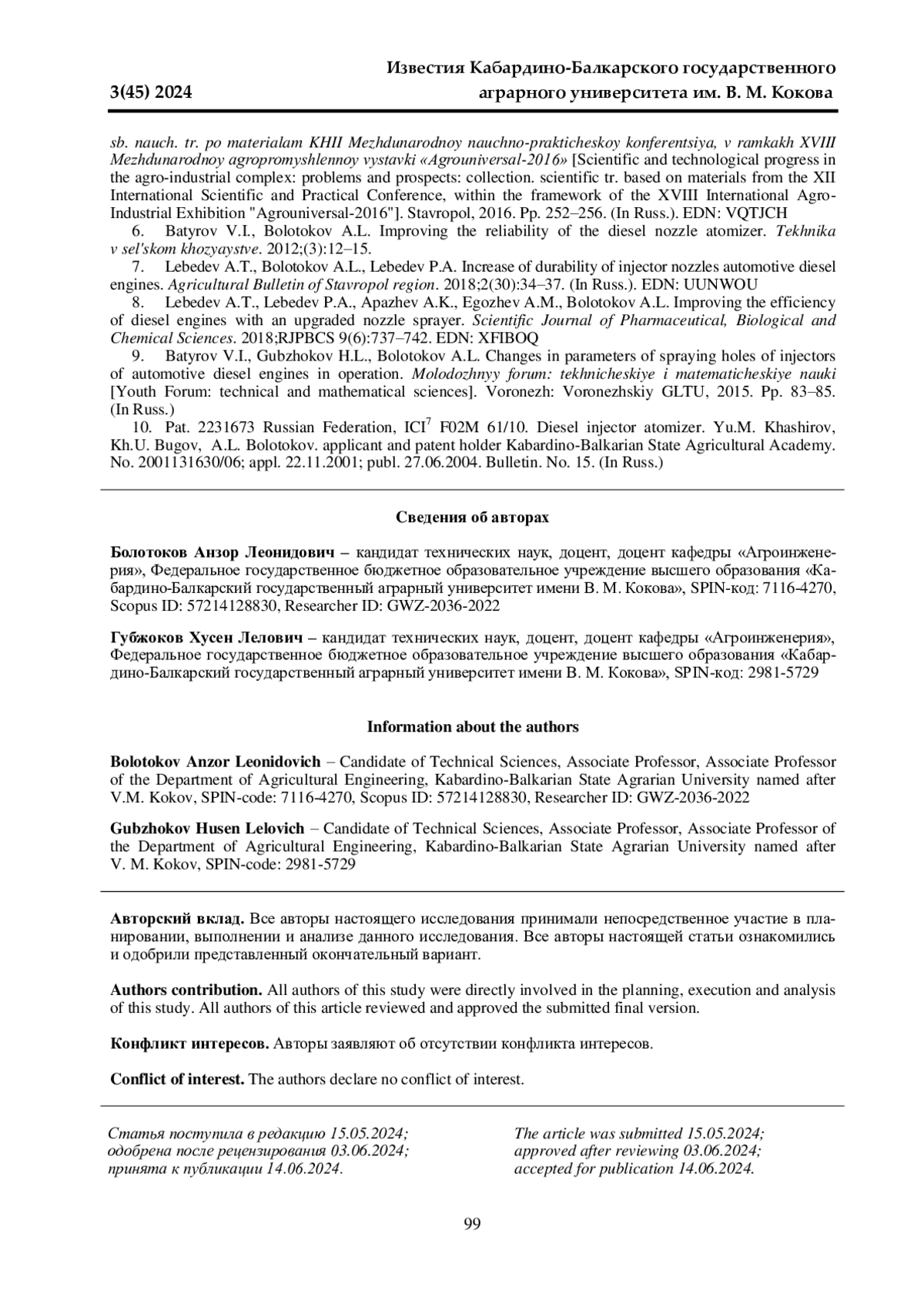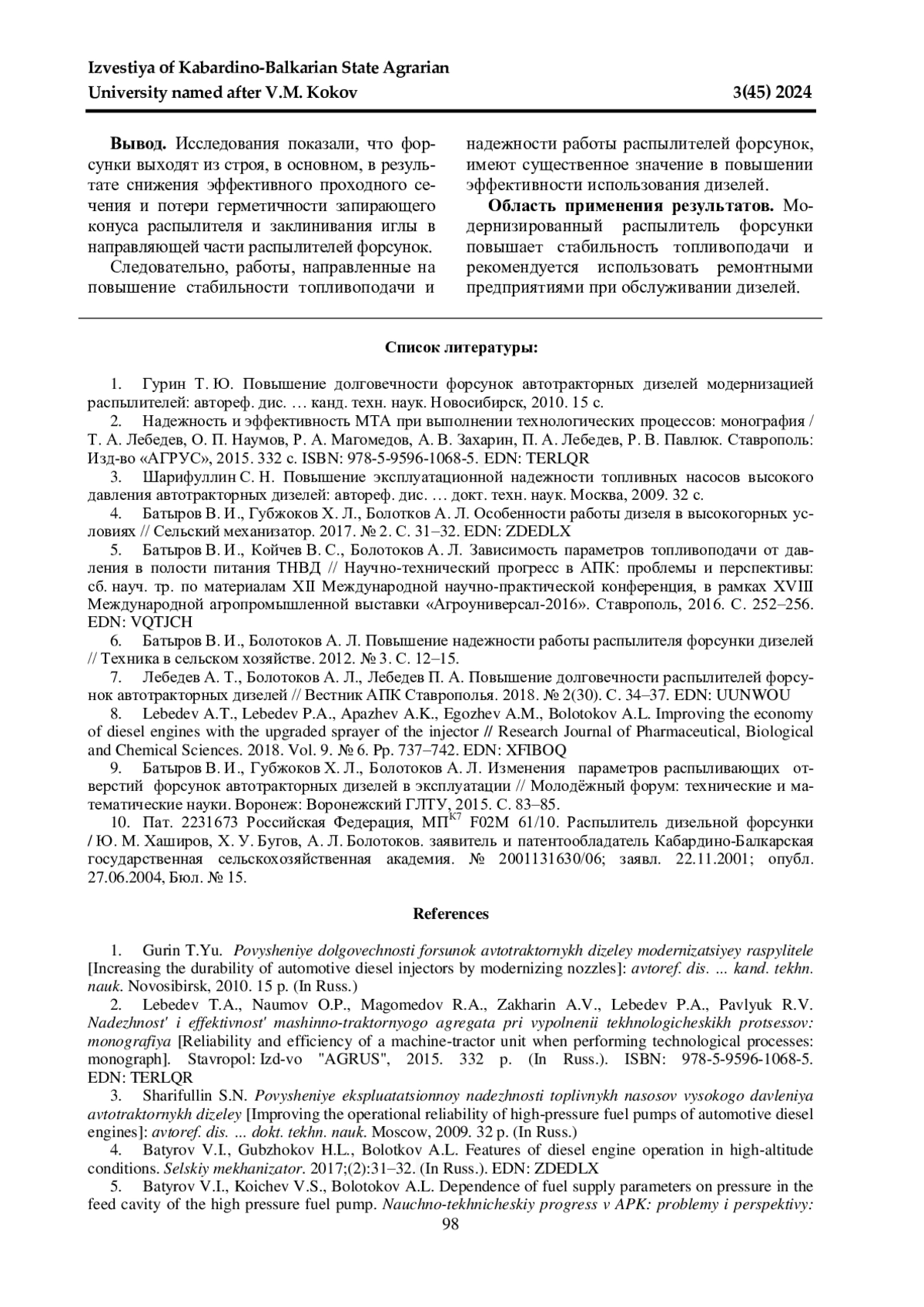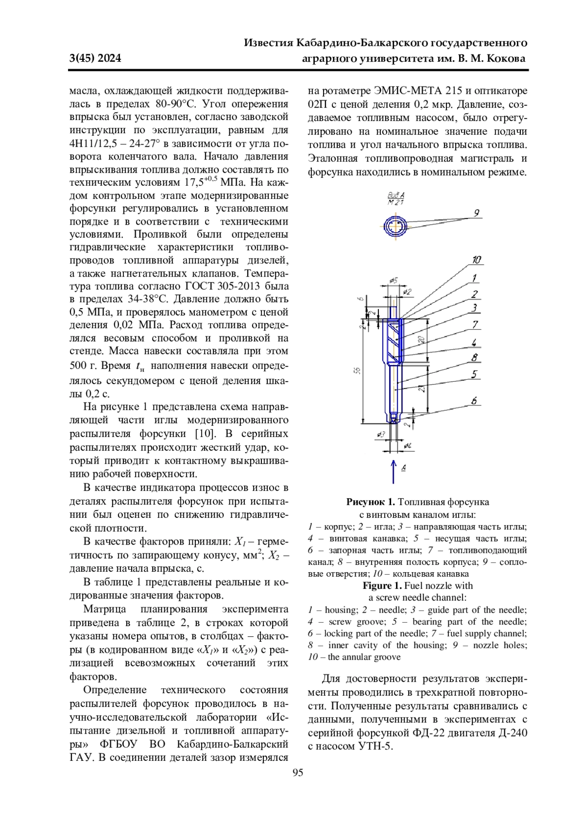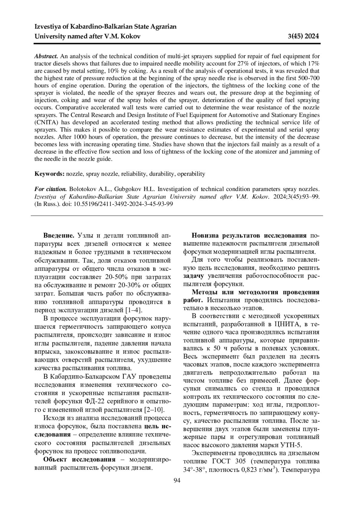 БОЛОТОКОВ А. Л., ГУБЖОКОВ Х. Л. ИССЛЕДОВАНИЕ ПАРАМЕТРОВ ТЕХНИЧЕСКОГО СОСТОЯНИЯ РАСПЫЛИТЕЛЕЙ ДИЗЕЛЬНЫХ ФОРСУНОК // ИЗВЕСТИЯ КАБАРДИНО-БАЛКАРСКОГО ГОСУДАРСТВЕННОГО АГРАРНОГО УНИВЕРСИТЕТА ИМ. В. М. КОКОВА. 2024. № 3 (45)