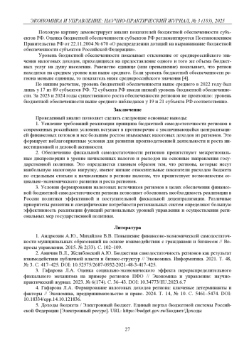 1. Андрюхин А.Ю., Михайлов В.В. Повышение финансово-экономической самодостаточности муниципальных образований на основе взаимодействия с гражданами и бизнесом // Вопросы управления. 2015. № 2(33). С. 102-109.