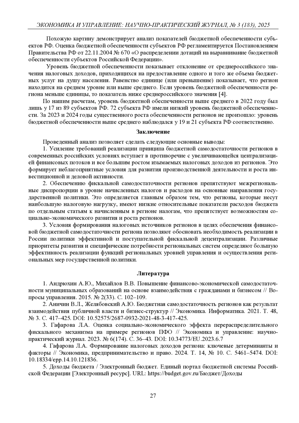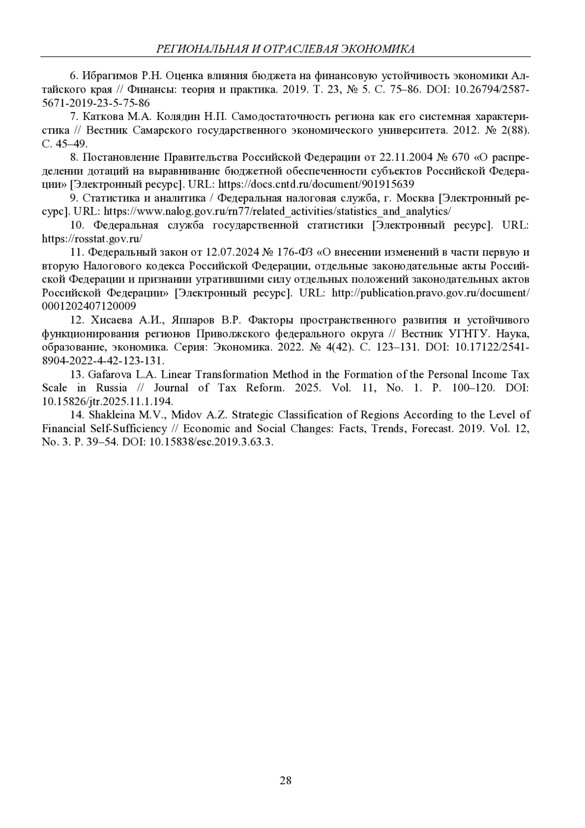 3. Гафарова Л.А. Оценка социально-экономического эффекта перераспределительного фискального механизма на примере регионов ПФО // Экономика и управление: научно-практический журнал. 2023. № 6(174). С. 36-43. DOI: 10.34773/EU.2023.6.7 EDN: WEHVQE