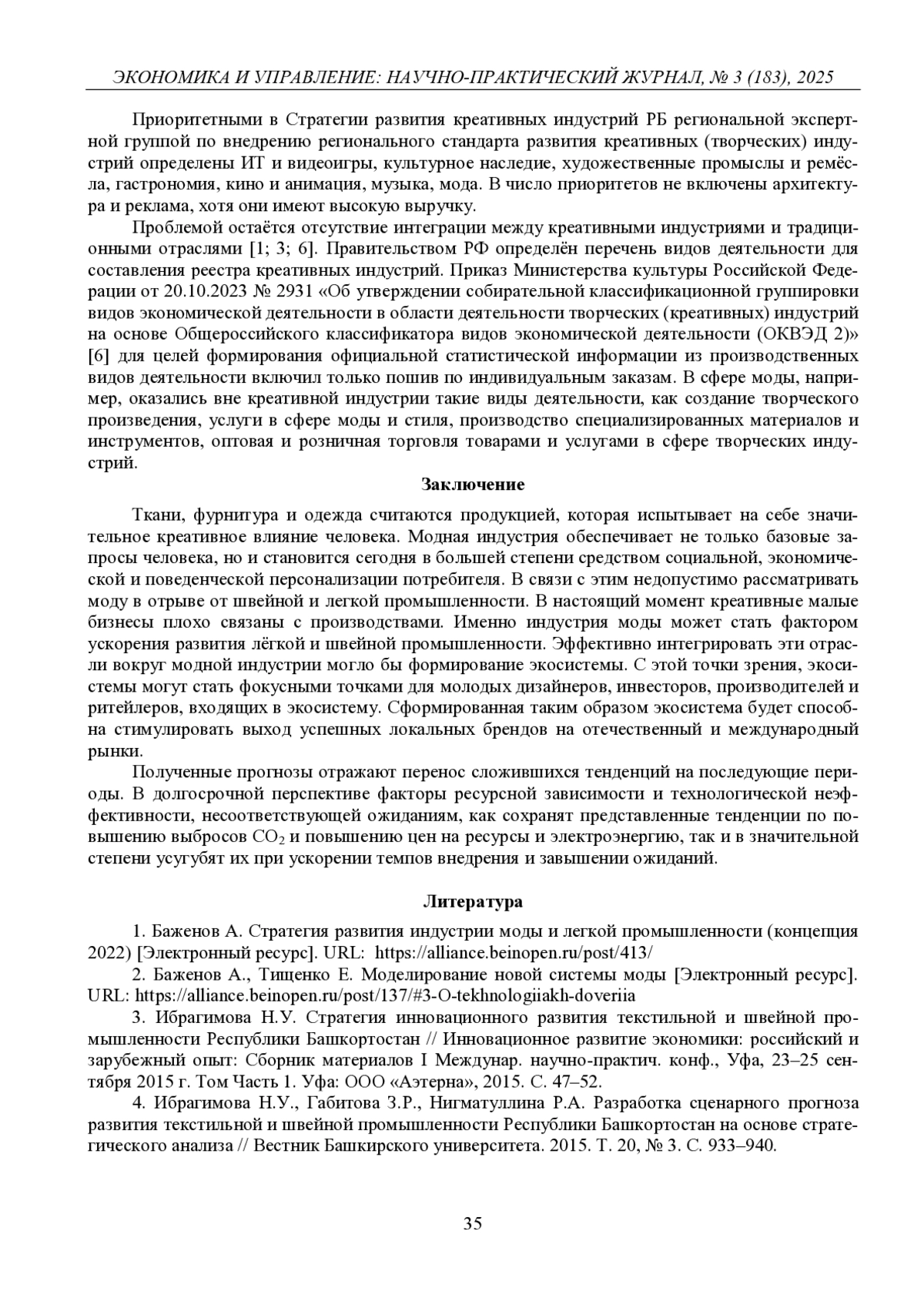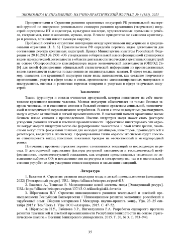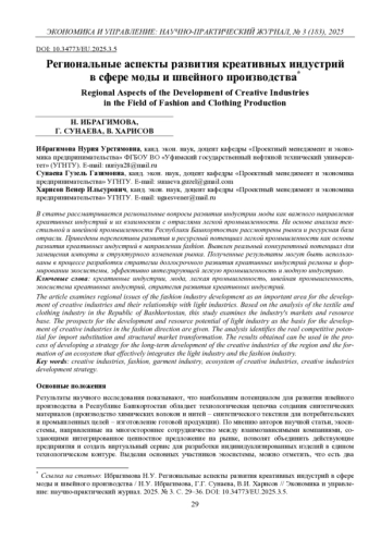 ИБРАГИМОВА Н. У., СУНАЕВА Г. Г., ХАРИСОВ В. И. РЕГИОНАЛЬНЫЕ АСПЕКТЫ РАЗВИТИЯ КРЕАТИВНЫХ ИНДУСТРИЙ В СФЕРЕ МОДЫ И ШВЕЙНОГО ПРОИЗВОДСТВА // ЭКОНОМИКА И УПРАВЛЕНИЕ: НАУЧНО-ПРАКТИЧЕСКИЙ ЖУРНАЛ. 2025. № 3 (183)