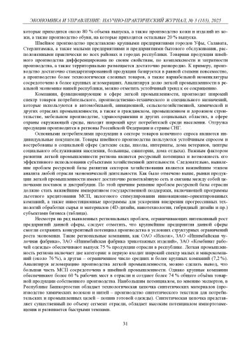 В статье рассматривается региональные вопросы развития индустрии моды как важного направления креативных индустрий и их взаимосвязи с отраслями легкой промышленности. На основе анализа текстильной и швейной промышленности Республики Башкортостан рассмотрены рынки и ресурсная база отрасли. Приведены перспективы развития и ресурсный потенциал легкой промышленности как основы развития креативных индустрий в направлении fashion. Выявлен реальный конкурентный потенциал для замещения импорта и структурного изменения рынка. Полученные результаты могут быть использованы в процессе разработки стратегии долгосрочного развития креативных индустрий региона и формировании экосистемы, эффективно интегрирующей легкую промышленность и модную индустрию.