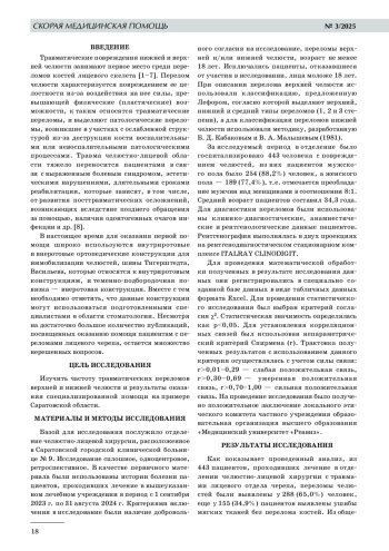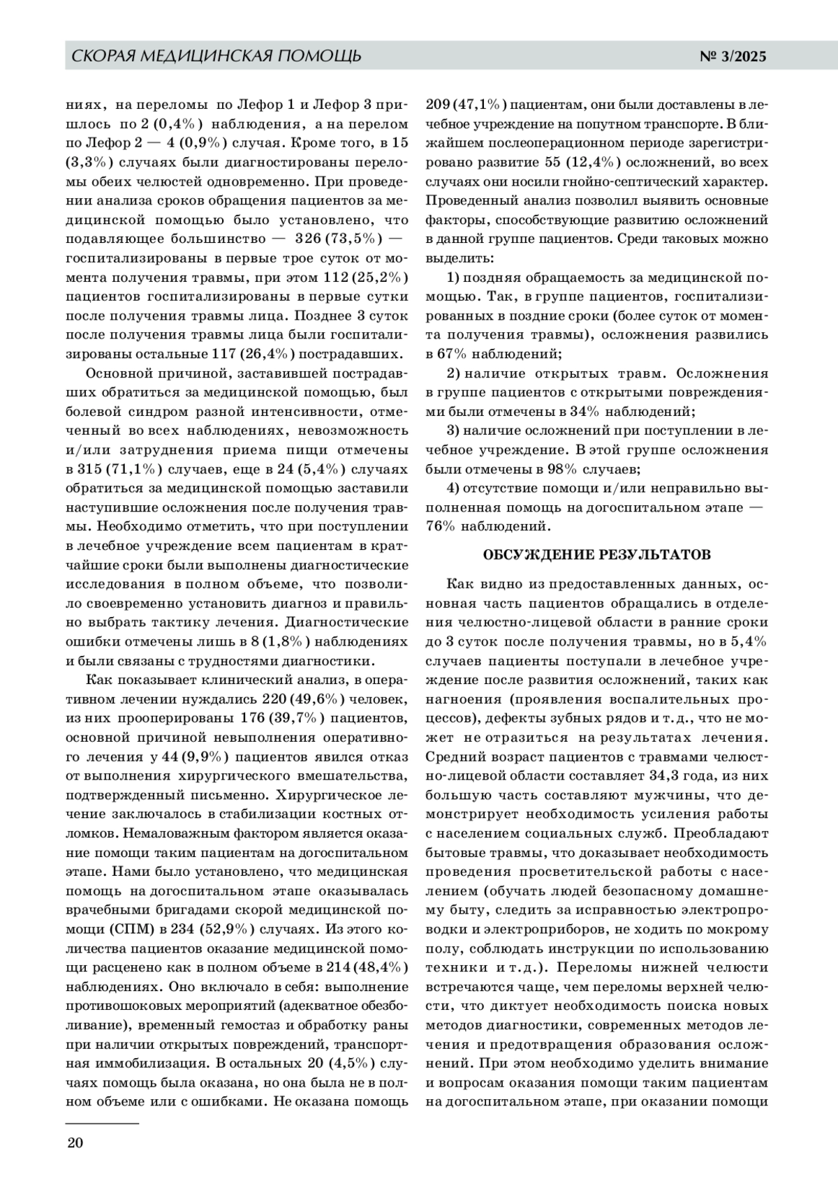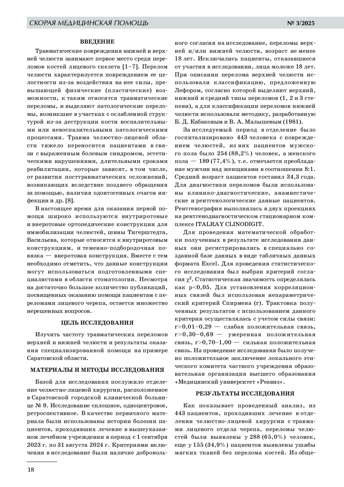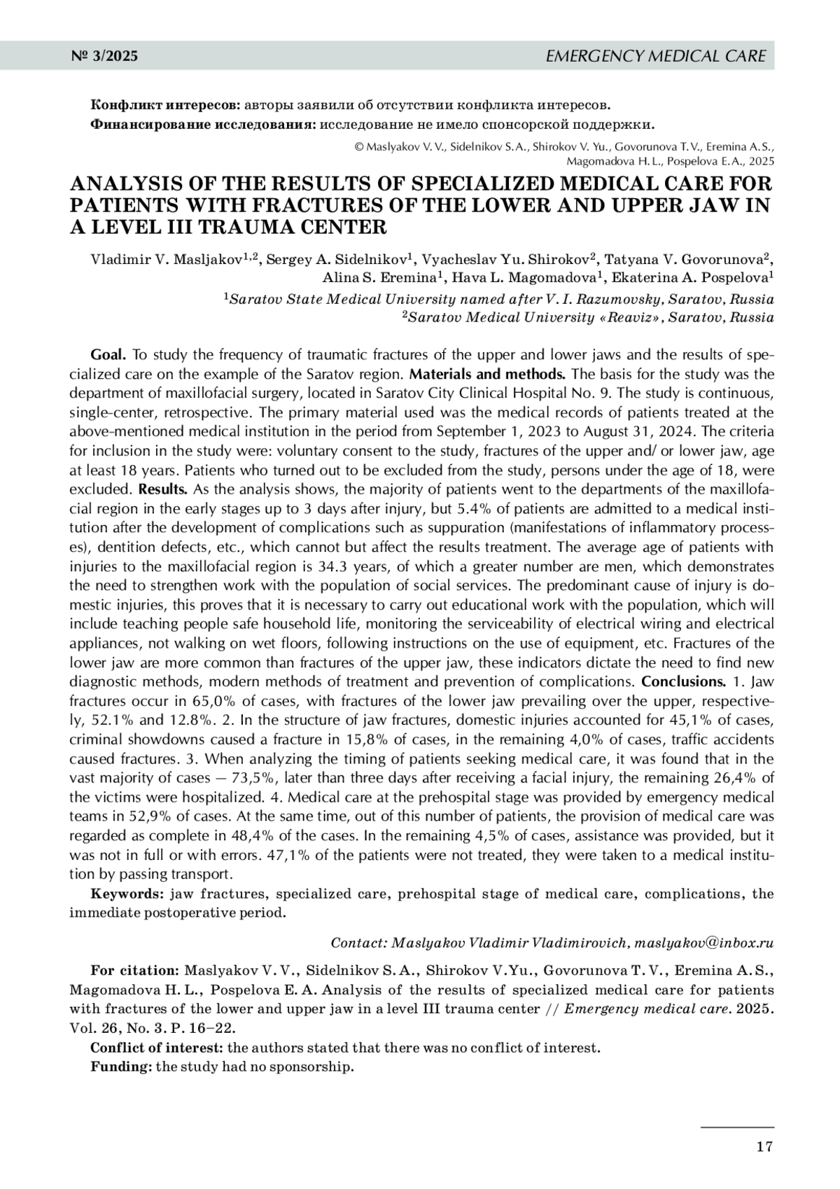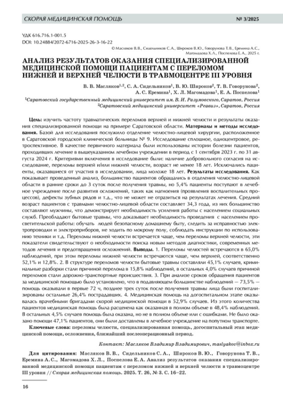 Цель: изучить частоту травматических переломов верхней и нижней челюсти и результаты оказания специализированной помощи на примере Саратовской области. Материалы и методы исследования. Базой для исследования послужило отделение челюстно- лицевой хирургии, расположенное в Саратовской городской клинической больницы № 9. Исследование сплошное, одноцентровое, ретроспективное. В качестве первичного материала были использованы истории болезни пациентов, проходивших лечение в вышеуказанном лечебном учреждении в период с 1 сентября 2023 г. по 31 августа 2024 г. Критериями включения в исследование были: наличие добровольного согласия на исследование, переломы верхней и/или нижней челюсти, возраст не менее 18 лет. Исключались пациенты, оказавшиеся от участия в исследовании, лица моложе 18 лет. Результаты исследования. Как показывает проведенный анализ, большинство пациентов обращались в отделения челюстно- лицевой области в ранние сроки до 3 суток после получения травмы, но 5,4% пациенты поступают в лечебное учреждение после развития осложнений, таких как нагноения (проявления воспалительных процессов), дефекты зубных рядов и т. д., что не может не отразиться на результатах лечения. Средний возраст пациентов с травмами челюстно- лицевой области составляет 34,3 года, из них большинство составляют мужчины, что демонстрирует необходимость усиления работы с населением социальных служб. Преобладают бытовые травмы, что доказывает необходимость проведения с населением просветительской работы: обучать людей безопасному домашнему быту, следить за исправностью электропроводки и электроприборов, не ходить по мокрому полу, соблюдать инструкции по использованию техники и т. д. Переломы нижней челюсти встречается чаще, чем переломы верхней челюсти, эти показатели свидетельствуют о необходимости поиска новым методов диагностики, современных методов лечения и предотвращения осложнений. Выводы. 1. Переломы челюстей встречаются в 65,0% наблюдений, при этом переломы нижней челюсти встречаются чаще, чем верхней, соответственно 52,1% и 12,8%. 2. В структуре переломов челюсти бытовые травмы составляли 45,1% случаев, криминальные разборки стали причиной перелома в 15,8% наблюдений, в остальных 4,0% случаев причиной переломов стали дорожно- транспортные происшествия. 3. При анализе сроков обращения пациентов за медицинской помощью было установлено, что в подавляющем большинстве наблюдений — 73,5% — помощь оказывали в первые 72 ч, позднее трех суток после получения травмы лица были госпитализированы остальные 26,4% пострадавших. 4. Медицинская помощь на догоспитальном этапе оказывалась врачебными бригадами скорой медицинской помощи в 52,9% случаев. Из этого количества пациентов медицинская помощь была расценена как оказанная в полном объеме в 48,4% наблюдений. В остальных 4,5% случаев помощь была оказана, но не в полном объеме или с ошибками. Не было оказано помощи 47,1% пациентов, они были доставлены в лечебное учреждение на попутном транспорте.