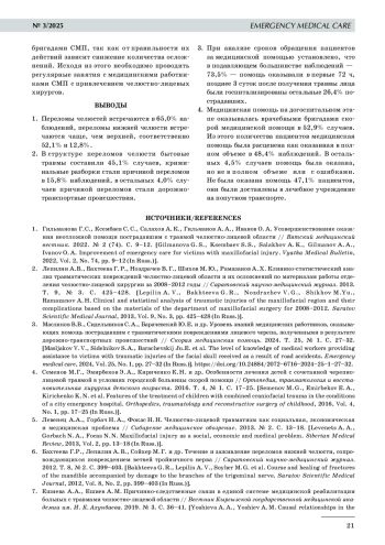 3. Масляков В.В., Сидельников С. А., Барачевский Ю. Е. и др. Уровень знаний медицинских работников, оказывающих помощь пострадавшим с травматическими повреждениями лицевого черепа, полученными в результате дорожно-транспортных происшествий // Скорая медицинская помощь. 2024. Т. 25, № 1. С. 27-32.