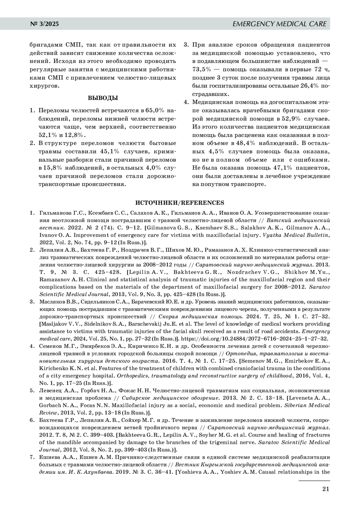 1. Гильманова Г.С., Ксембаев С. С., Салахов А. К., Гильманов А. А., Иванов О. А. Усовершенствование оказания неотложной помощи пострадавшим с травмой челюстно-лицевой области // Вятский медицинский вестник. 2022. № 2 (74). С. 9-12.