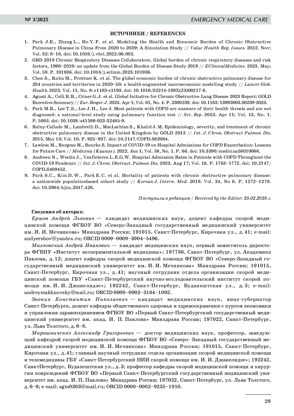1. Park J.E., Zhang L., Ho Y. F. et al. Modeling the Health and Economic Burden of Chronic Obstructive Pulmonary Disease in China From 2020 to 2039: A Simulation Study // Value Health Reg. Issues. 2022. Nov; Vol. 32: 8-16. DOI: 10.1016/j.vhri.2022.06.002