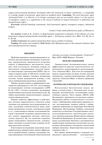 Проблема надежного интраоперационного гемостаза при выполнении экстренных и неотложных хирургических вмешательств на органах живота и забрюшинного пространства сохраняет свою актуальность. В первую очередь это обусловлено сохраняющейся частотой дорожно- транспортных происшествий (ДТП), при которых в нашей стране до 130 тысяч человек ежегодно получают травмы, становясь пациентами системы скорой медицинской помощи, в том числе травмоцентров различного уровня [1].