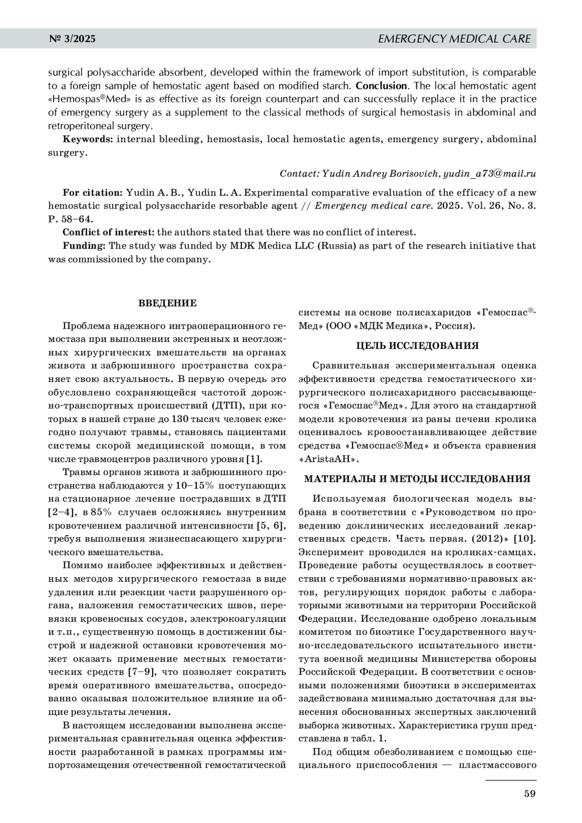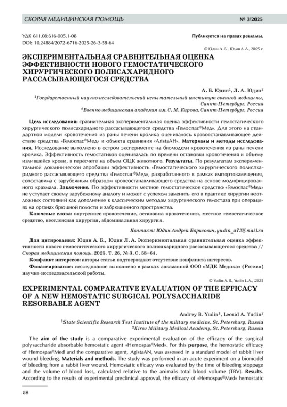 Цель исследования: сравнительная экспериментальная оценка эффективности гемостатического хирургического полисахаридного рассасывающегося средства «Гемоспас®Мед». Для этого на стандартной модели кровотечения из раны печени кролика оценивалось кровоостанавливающее действие средства «Гемоспас®Мед» и объекта сравнения «AristaАН». Материалы и методы исследования. Исследование выполнено в остром эксперименте на биомодели кровотечения из раны печени кролика. Эффективность гемостатиков оценивалась по времени остановки кровотечения и объему излившейся крови, в пересчете на объем ОЦК животного. Результаты. По результатам экспериментальной доклинической апробации эффективность «Гемостатического хирургического полисахаридного рассасывающего средства «Гемоспас®Мед», разработанного в рамках импортозамещения, сопоставима с зарубежным образцом кровеостанавливающего средства на основе модифицированного крахмала. Заключение. По эффективности местное гемостатическое средство «Гемоспас®Мед» не уступает своему зарубежному аналогу и может с успехом заменить его в практике хирургии неотложных состояний как дополнение к классическим методам хирургического гемостаза при операциях на органах брюшной полости и забрюшинного пространства.