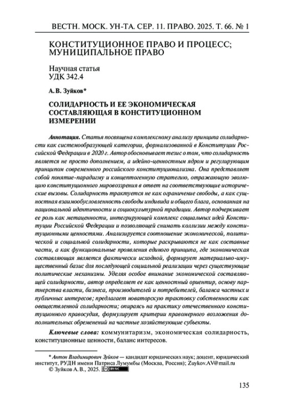 Статья посвящена комплексному анализу принципа солидарности как системообразующей категории, формализованной в Конституции Российской Федерации в 2020 г. Автор обосновывает тезис о том, что солидарность является не просто дополнением, а идейно-ценностным ядром и регулирующим принципом современного российского конституционализма. Она представляет собой понятие-парадигму и концептогенную стратегию, отражающую эволюцию конституционного мировоззрения в ответ на соответствующие исторические вызовы. Солидарность трактуется не как ограничение свободы, а как сущностная взаимообусловленность свободы индивида и общего блага, основанная на национальной идентичности и социокультурной традиции. Автор подчеркивает ее роль как метаценности, интегрирующей комплекс социальных идей Конституции Российской Федерации и позволяющей снимать коллизии между конституционными ценностями. Анализируется соотношение экономической, политической и социальной солидарности, которые раскрываются не как составные части, а как функциональные проявления единого принципа, где экономическая составляющая является фактически исходной, формирует материально-имущественный базис для последующей социальной реализации через существующие политические механизмы. Уделяя особое внимание экономической составляющей солидарности, автор определяет ее как ценностный ориентир, основу партнерства власти, бизнеса, производителей и потребителей, баланса частных и публичных интересов; предлагает новаторскую трактовку собственности как овеществленной солидарности; опираясь на практику отечественного конституционного правосудия, формулирует критерии правомерного возложения дополнительных обременений на частные хозяйствующие субъекты.