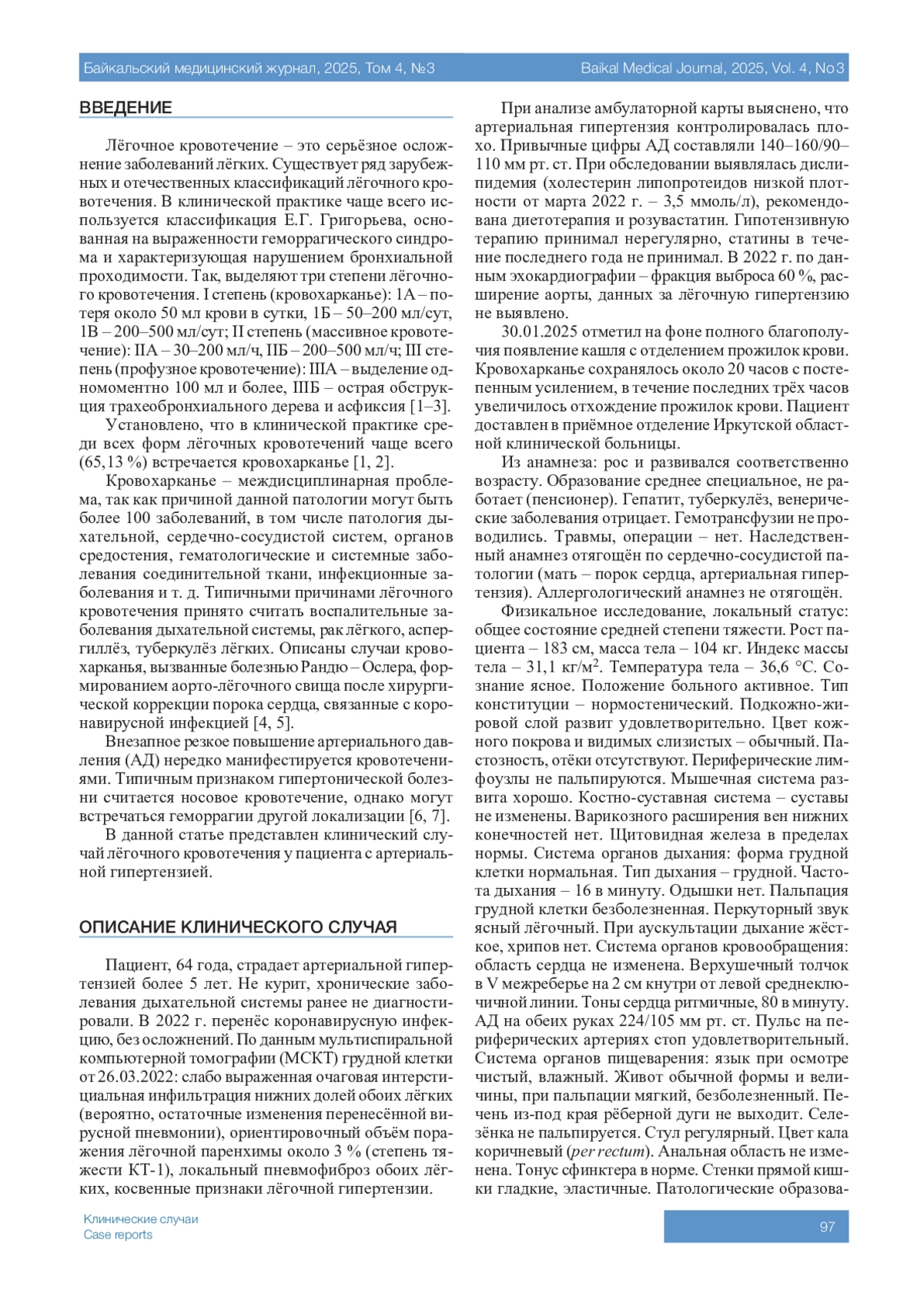 Статья: ЛЁГОЧНОЕ КРОВОТЕЧЕНИЕ У ПАЦИЕНТА С НЕКОНТРОЛИРУЕМОЙ АРТЕРИАЛЬНОЙ ГИПЕРТЕНЗИЕЙ (2025)