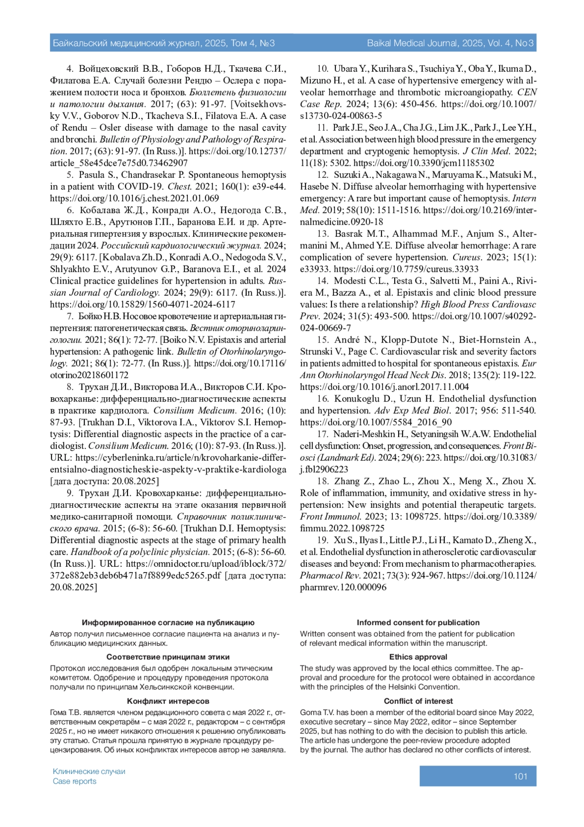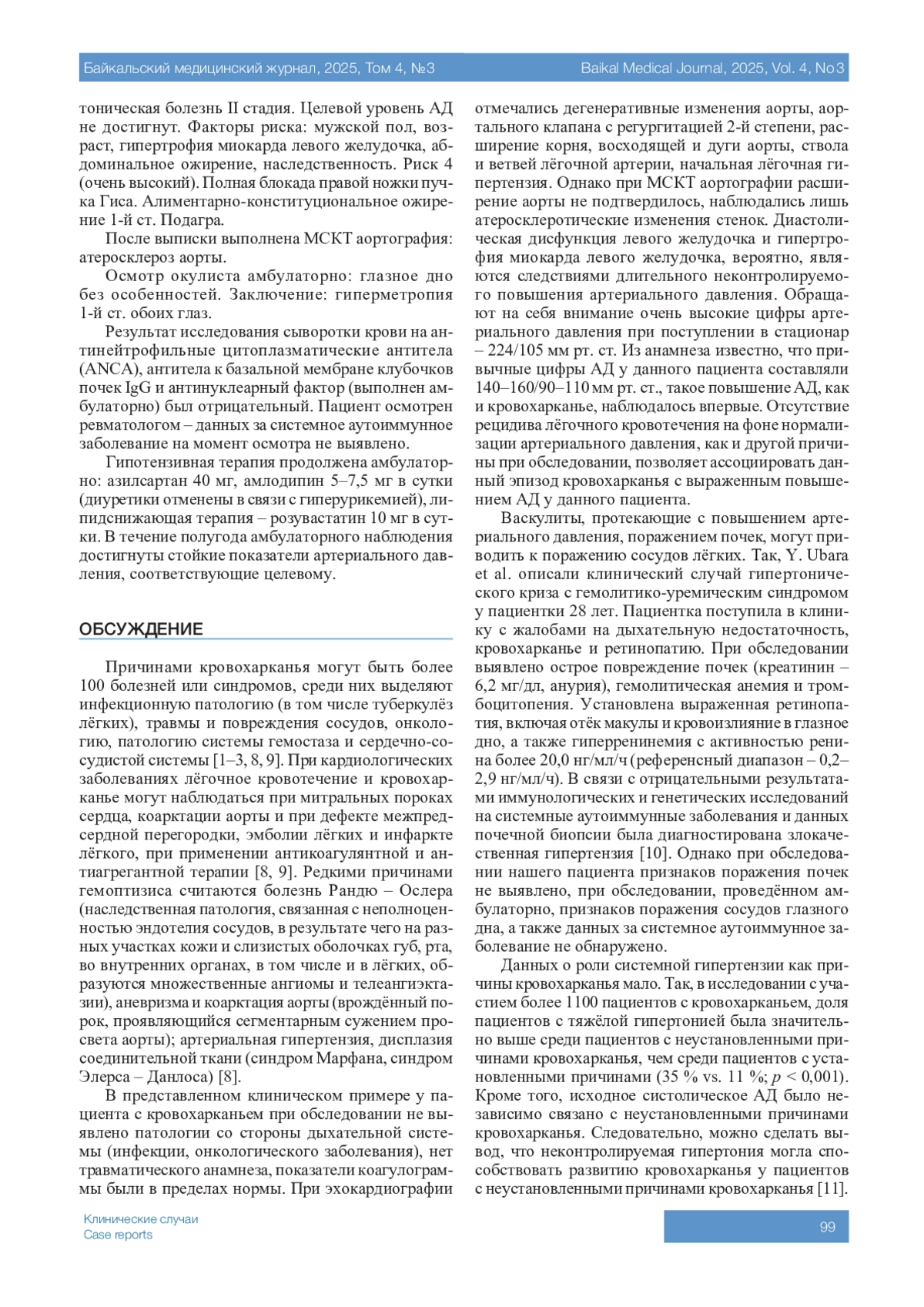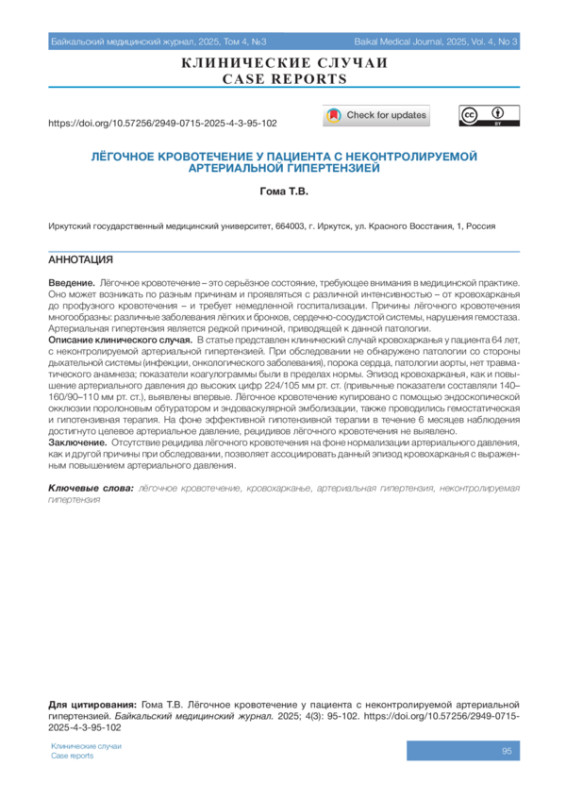 ГОМА Т.В. ЛЁГОЧНОЕ КРОВОТЕЧЕНИЕ У ПАЦИЕНТА С НЕКОНТРОЛИРУЕМОЙ АРТЕРИАЛЬНОЙ ГИПЕРТЕНЗИЕЙ // БАЙКАЛЬСКИЙ МЕДИЦИНСКИЙ ЖУРНАЛ. 2025. № 3, ТОМ 4