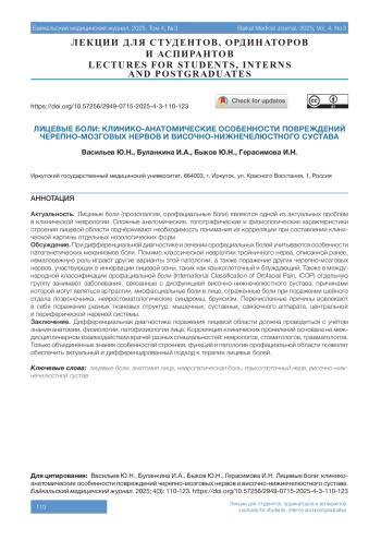Заключение. Дифференциальная диагностика поражения лицевой области должна проводиться с учётом знания анатомии, физиологии, патофизиологии лица. Корреляция клинических проявлений основана на междисциплинарном взаимодействии врачей разных специальностей: неврологов, стоматологов, травматологов. Только объединённые знания особенностей строения, функций и патологии орофациальной области позволят обеспечить актуальный и дифференцированный подход к терапии лицевых болей.