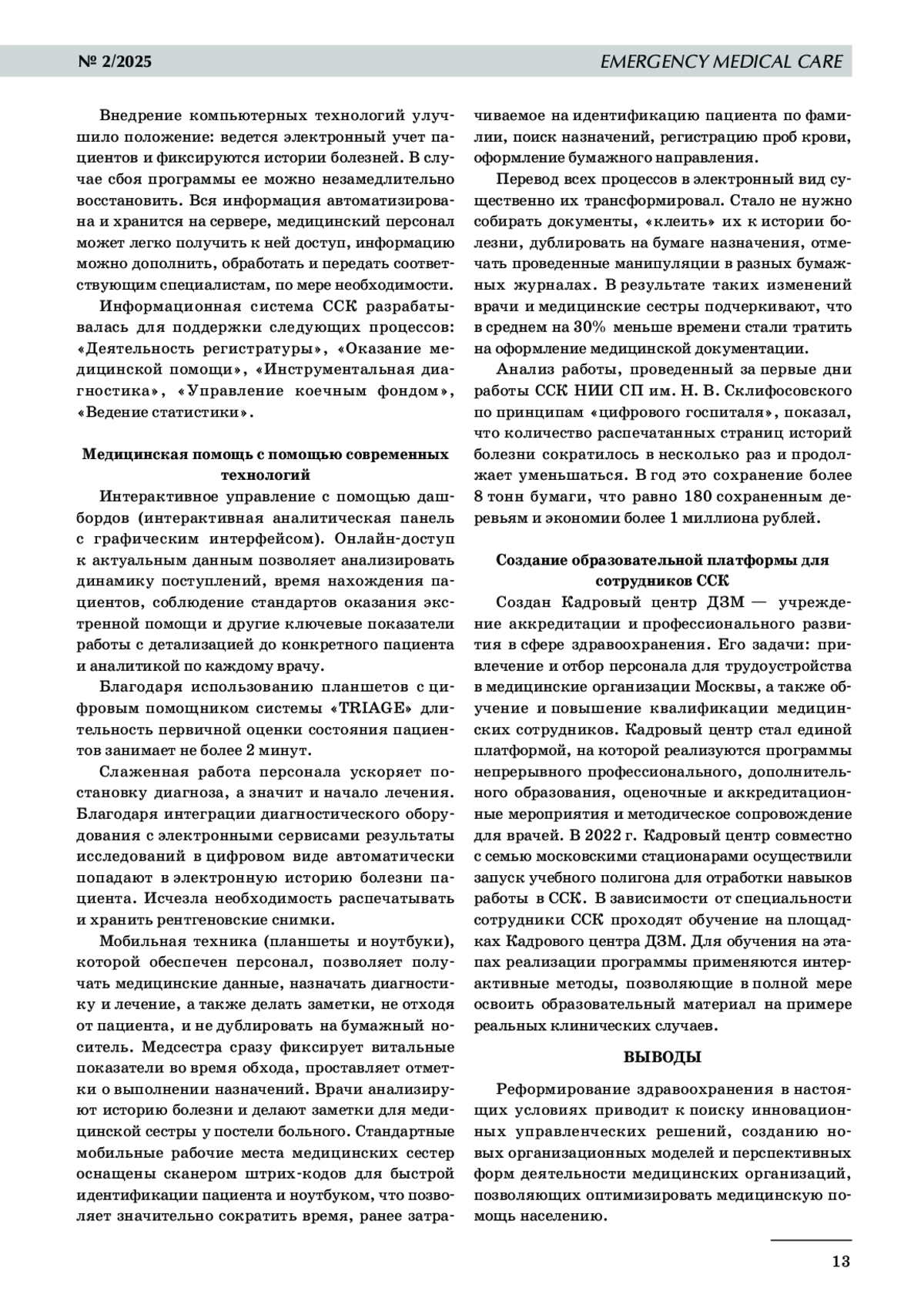 1. Багненко С.Ф., Миннуллин И. П., Теплов В. М., Разумный Н. В. Эволюция скорой медицинской помощи: от поля боя до стационарного звена // Скорая медицинская помощь. 2015. Т. 16, № 3. С. 4-9.