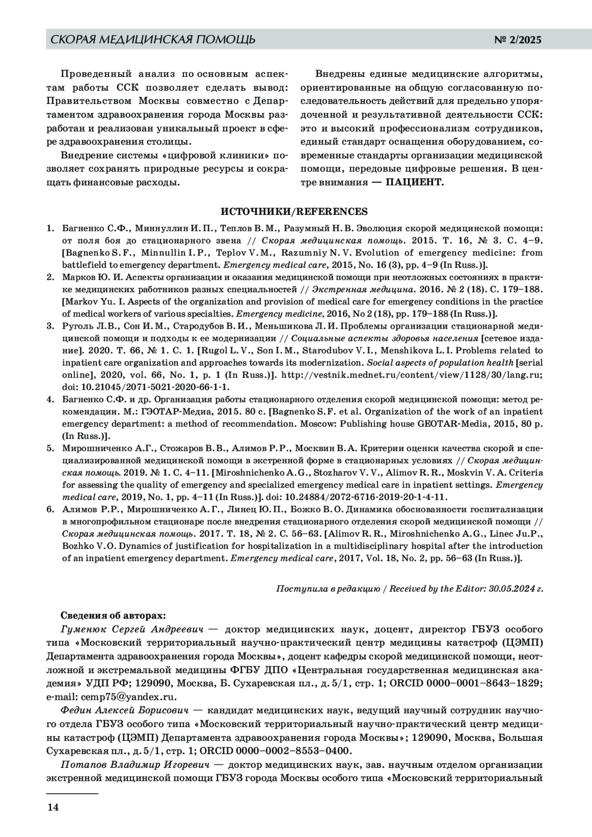 6. Алимов Р.Р., Мирошниченко А. Г., Линец Ю. П., Божко В. О. Динамика обоснованности госпитализации в многопрофильном стационаре после внедрения стационарного отделения скорой медицинской помощи // Скорая медицинская помощь. 2017. Т. 18, № 2. С. 56-63.