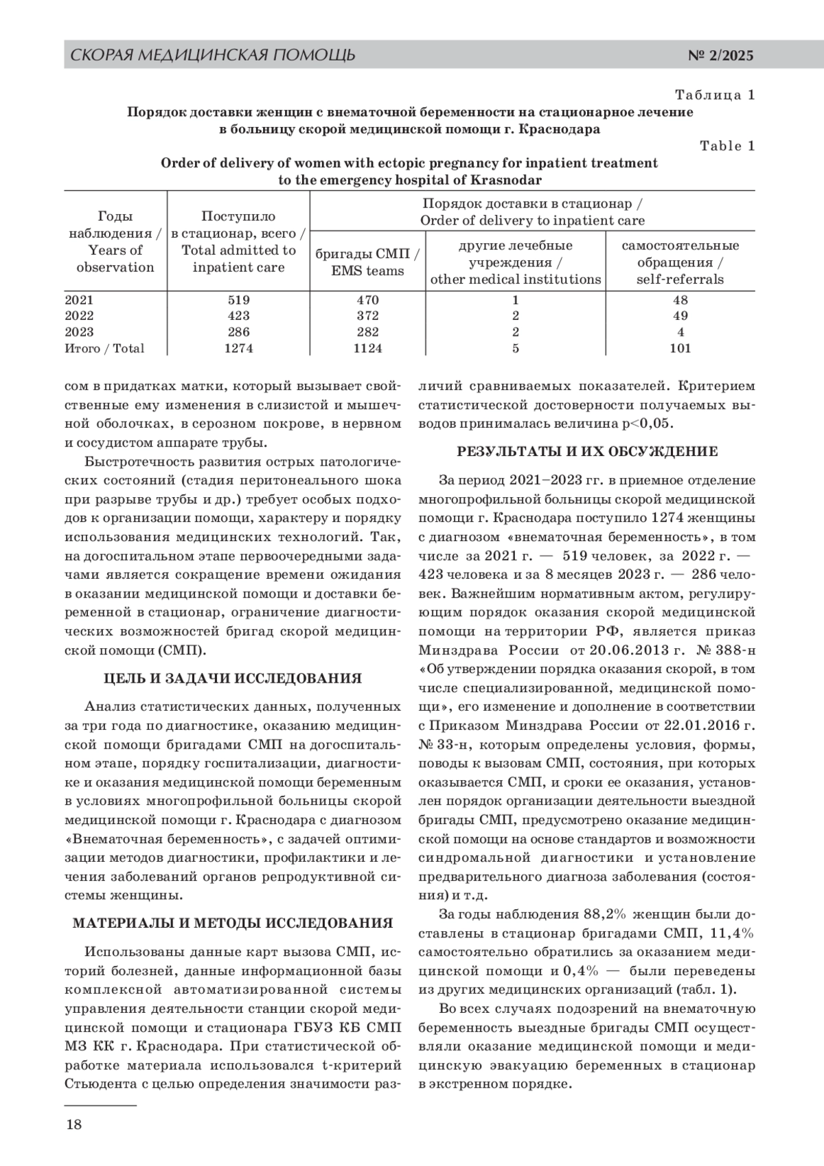 Исследование причин и условий развития внематочной (эктопической) беременности до сегодняшнего дня остается одной из важнейших проблем современного здравоохранения по причине неуклонного роста случаев возникновения данного осложнения беременности и возможного развития при этом неблагоприятных отдаленных последствий. Целью данного исследования явился анализ статистических данных, полученных за три года, по диагностике на догоспитальном этапе, госпитализации и оказанию медицинской помощи пациентам в условиях многопрофильной больницы скорой медицинской помощи г. Краснодар с диагнозом «Внематочная беременность», с задачей оптимизации методов диагностики, профилактики и лечения заболеваний органов репродуктивной системы женщин. Материалы и методы исследования. Использованы данные информационной базы комплексной автоматизированной системы управления деятельностью станции скорой медицинской помощи и стационара ГБУЗ КБСМП МЗКК г. Краснодара, данные карт вызовов станций скорой медицинской помощи и историй болезни. Результаты исследования. Для качественной диагностики, лечения и профилактики заболеваний репродуктивной системы женщин необходимо уделять большое внимание своевременному выявлению основных факторов риска, приводящих к развитию различных патологических процессов у беременных, особенно в первые недели беременности.