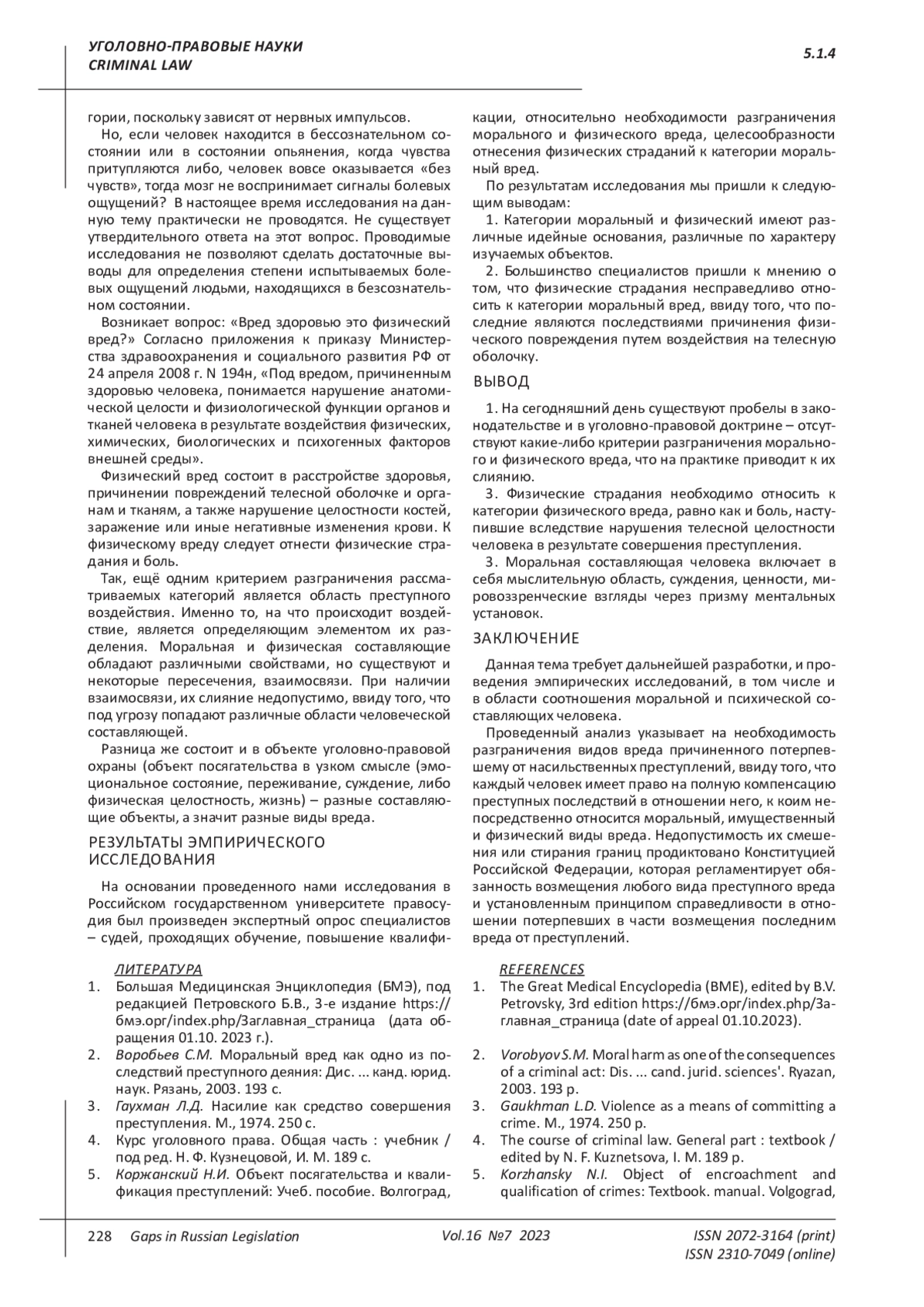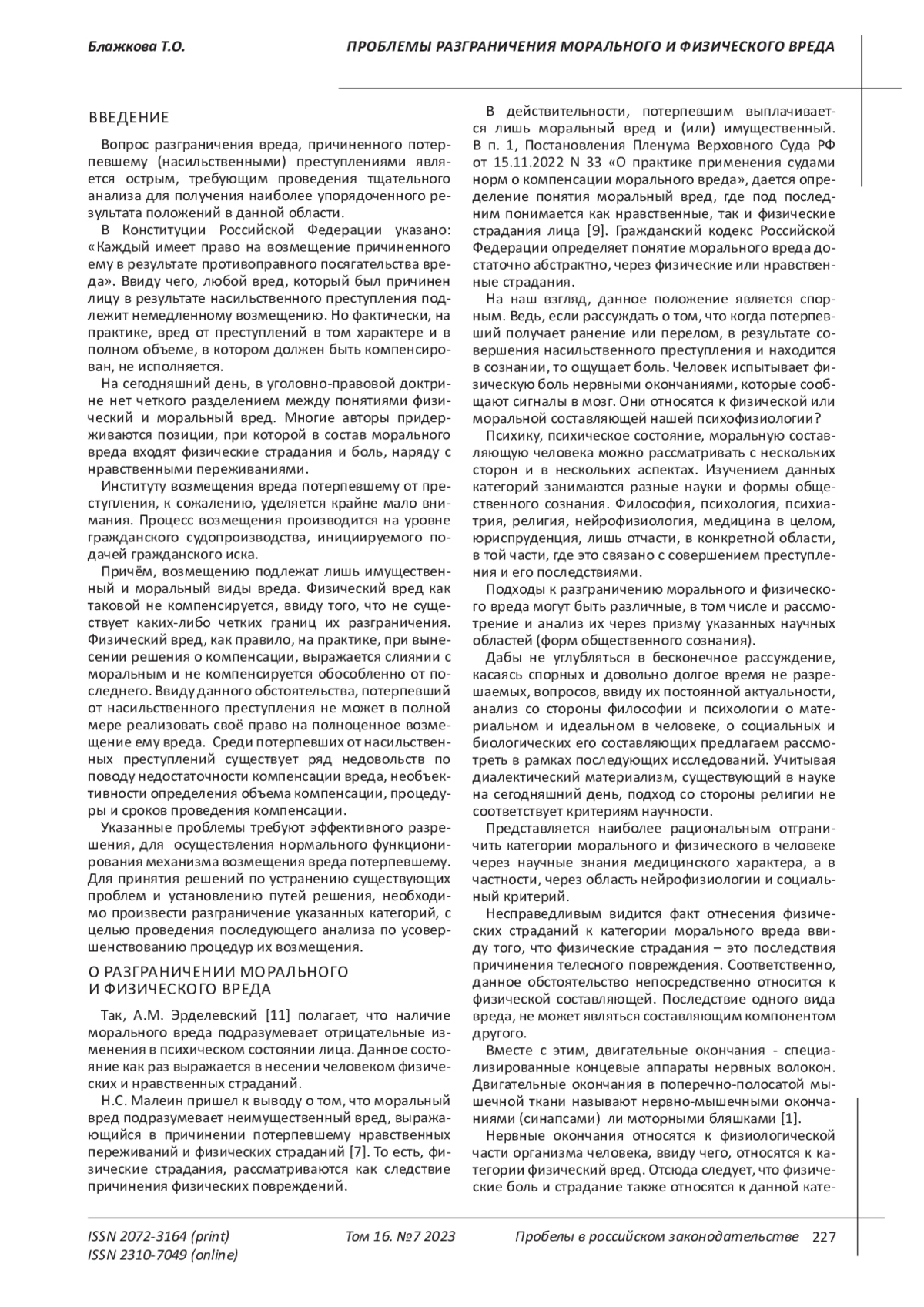 БЛАЖКОВА Т. О. ПРОБЛЕМЫ РАЗГРАНИЧЕНИЯ МОРАЛЬНОГО И ФИЗИЧЕСКОГО ВРЕДА // ПРОБЕЛЫ В РОССИЙСКОМ ЗАКОНОДАТЕЛЬСТВЕ. 2023. Т. 16 № 7 (42 СТ.)