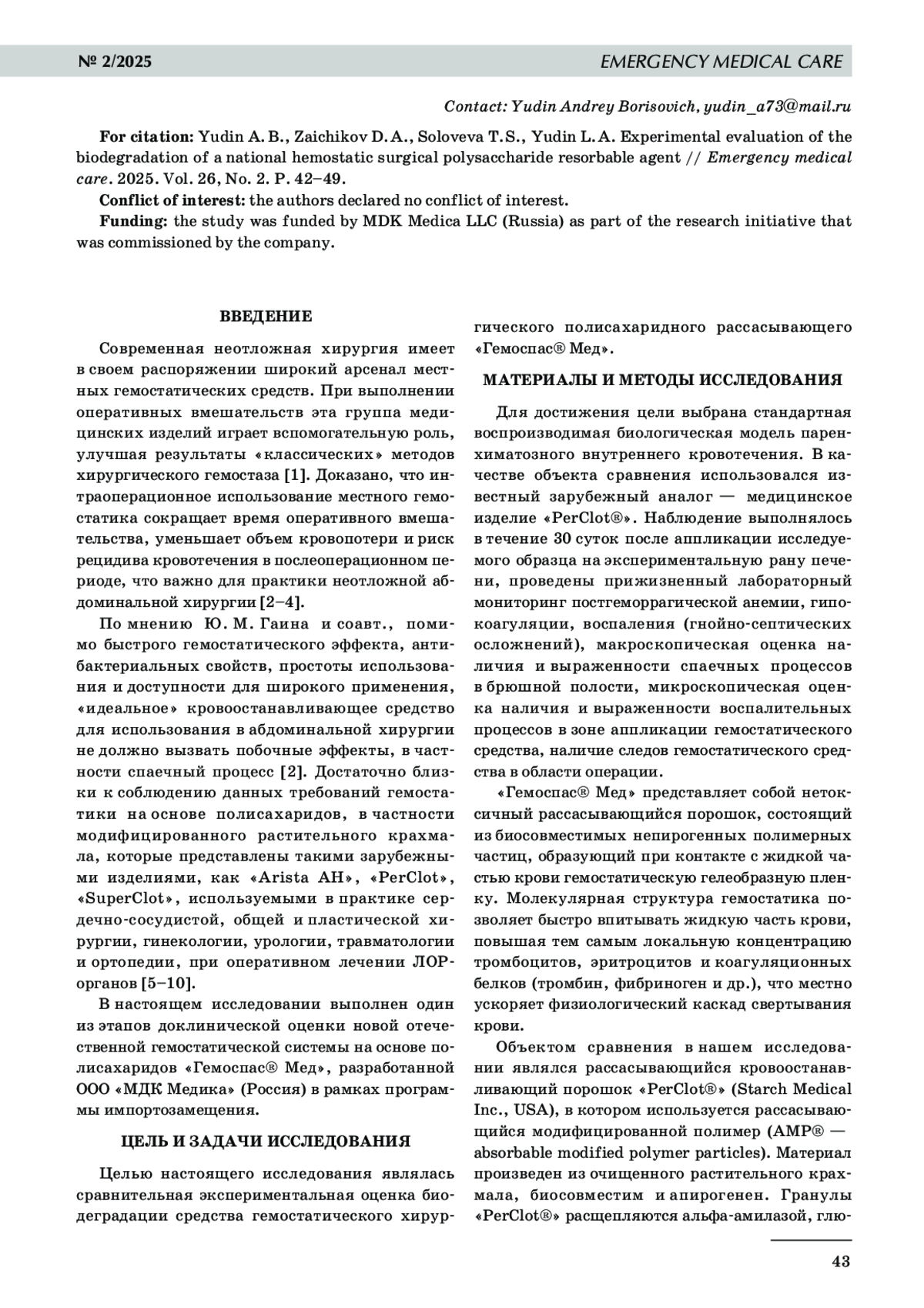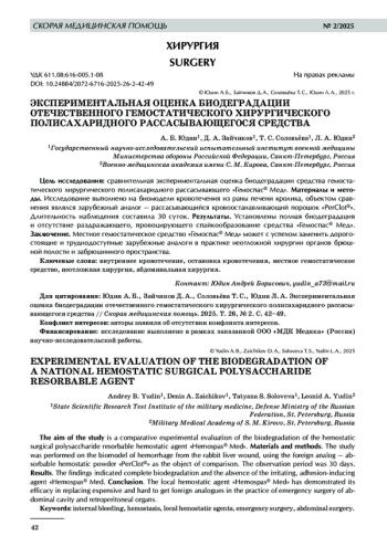 Современная неотложная хирургия имеет в своем распоряжении широкий арсенал местных гемостатических средств. При выполнении оперативных вмешательств эта группа медицинских изделий играет вспомогательную роль, улучшая результаты «классических» методов хирургического гемостаза [1]. Доказано, что интраоперационное использование местного гемостатика сокращает время оперативного вмешательства, уменьшает объем кровопотери и риск рецидива кровотечения в послеоперационном периоде, что важно для практики неотложной абдоминальной хирургии [2–4].