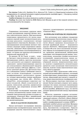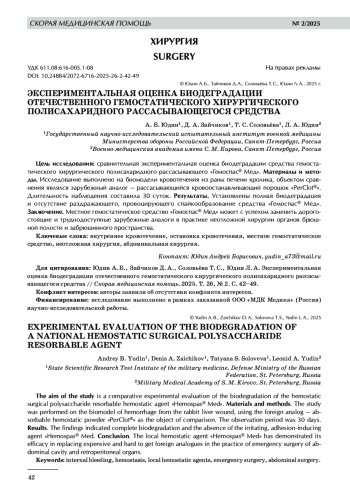Цель исследования: сравнительная экспериментальная оценка биодеградации средства гемостатического хирургического полисахаридного рассасывающего «Гемоспас® Мед». Материалы и методы. Исследование выполнено на биомодели кровотечения из раны печени кролика, объектом сравнения являлся зарубежный аналог — рассасывающийся кровоостанавливающий порошок «PerClot®». Длительность наблюдения составила 30 суток. Результаты. Установлены полная биодеградация и отсутствие раздражающего, провоцирующего спайкообразование средства «Гемоспас® Мед». Заключение. Местное гемостатическое средство «Гемоспас® Мед» может с успехом заменить дорогостоящие и труднодоступные зарубежные аналоги в практике неотложной хирургии органов брюшной полости и забрюшинного пространства.