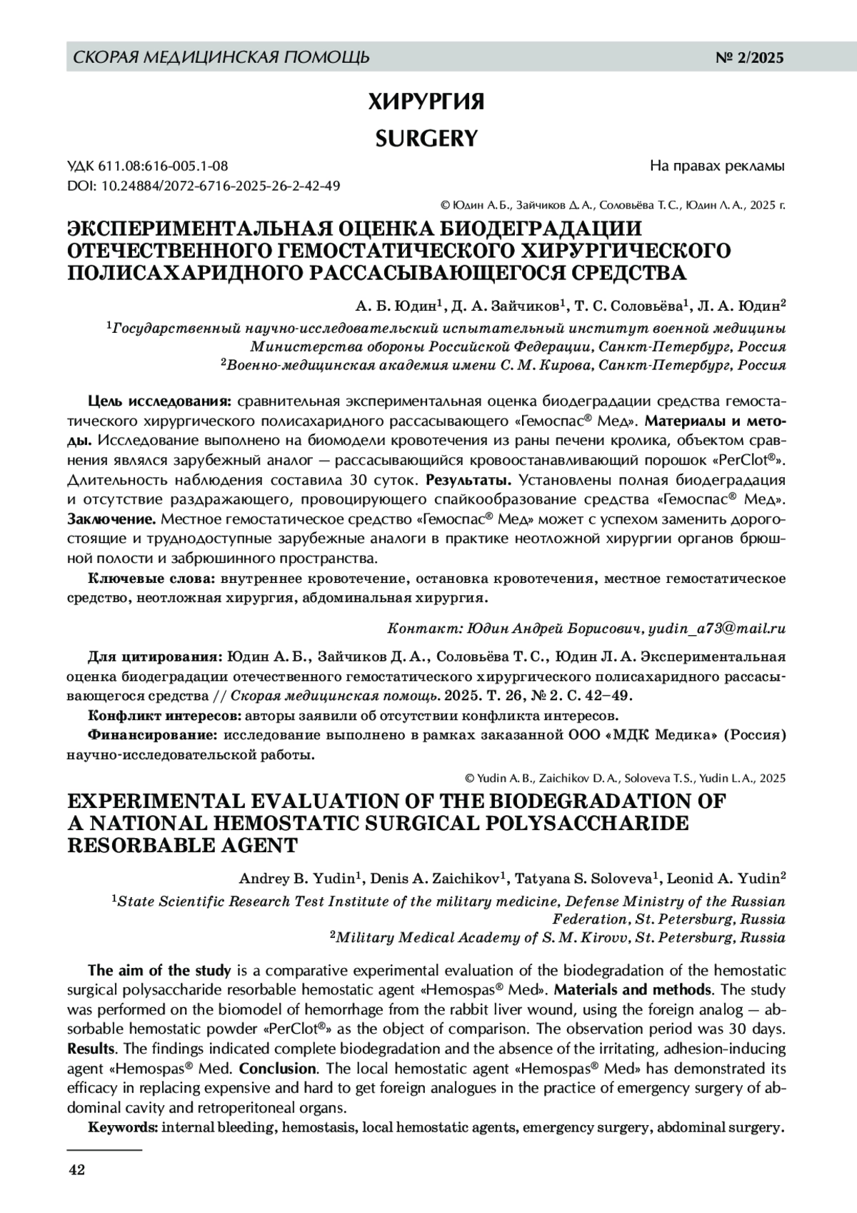 Gain Yu.M., Aleksandrova O. S., Gapanovich V. N. Modern methods of local hemostasis in damage to parenchymatous abdominal organs. Surgery News, 2009, Vol. 17, No. 4, рр. 160-171 (In Russ.).