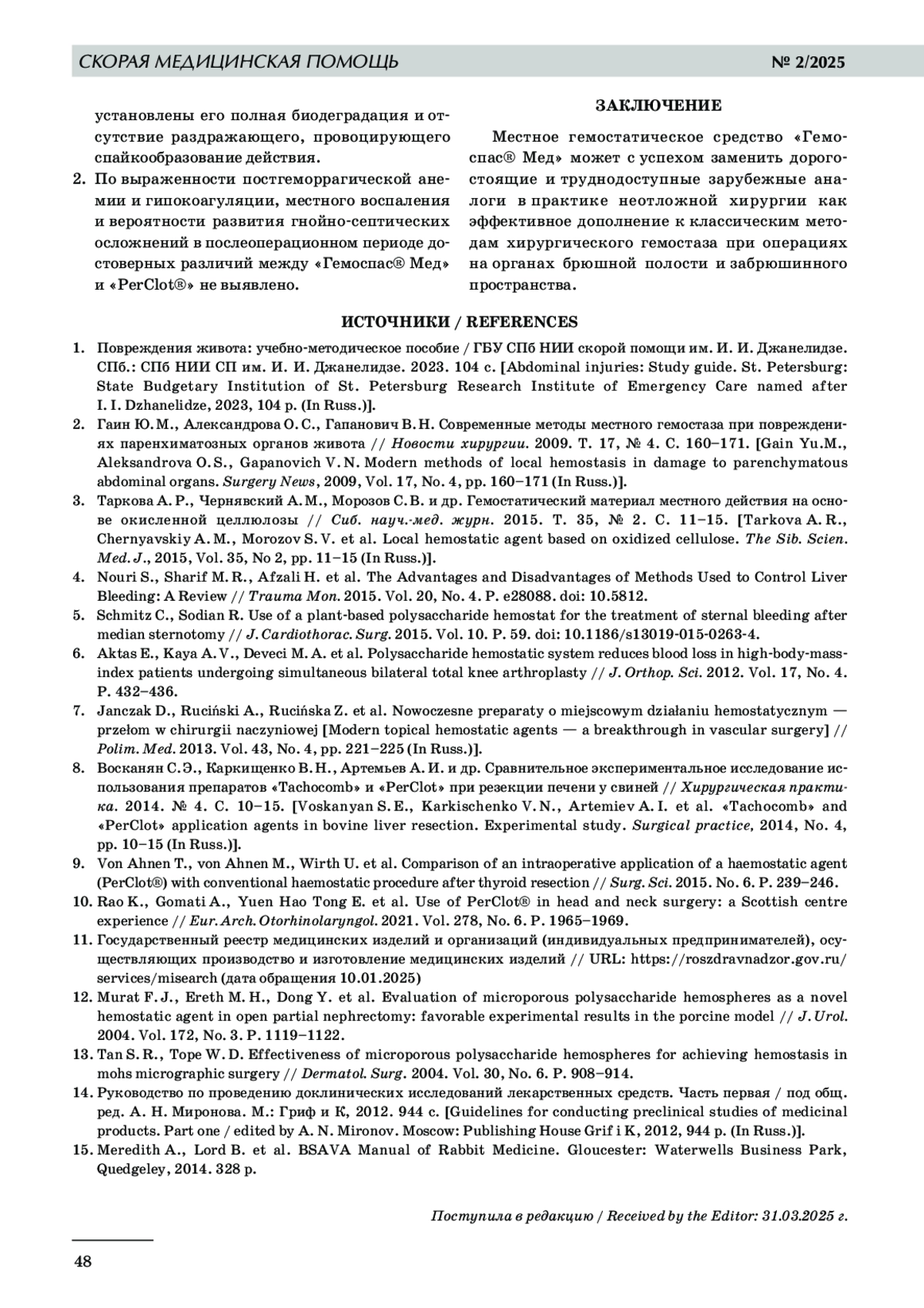 7. Janczak D., Rucinski A., Rucinska Z. et al. Nowoczesne preparaty o miejscowym dzialaniu hemostatycznym - przelom w chirurgii naczyniowej [Modern topical hemostatic agents - a breakthrough in vascular surgery] // Polim. Med. 2013. Vol. 43, No. 4, рр. 221-225 (In Russ.)].