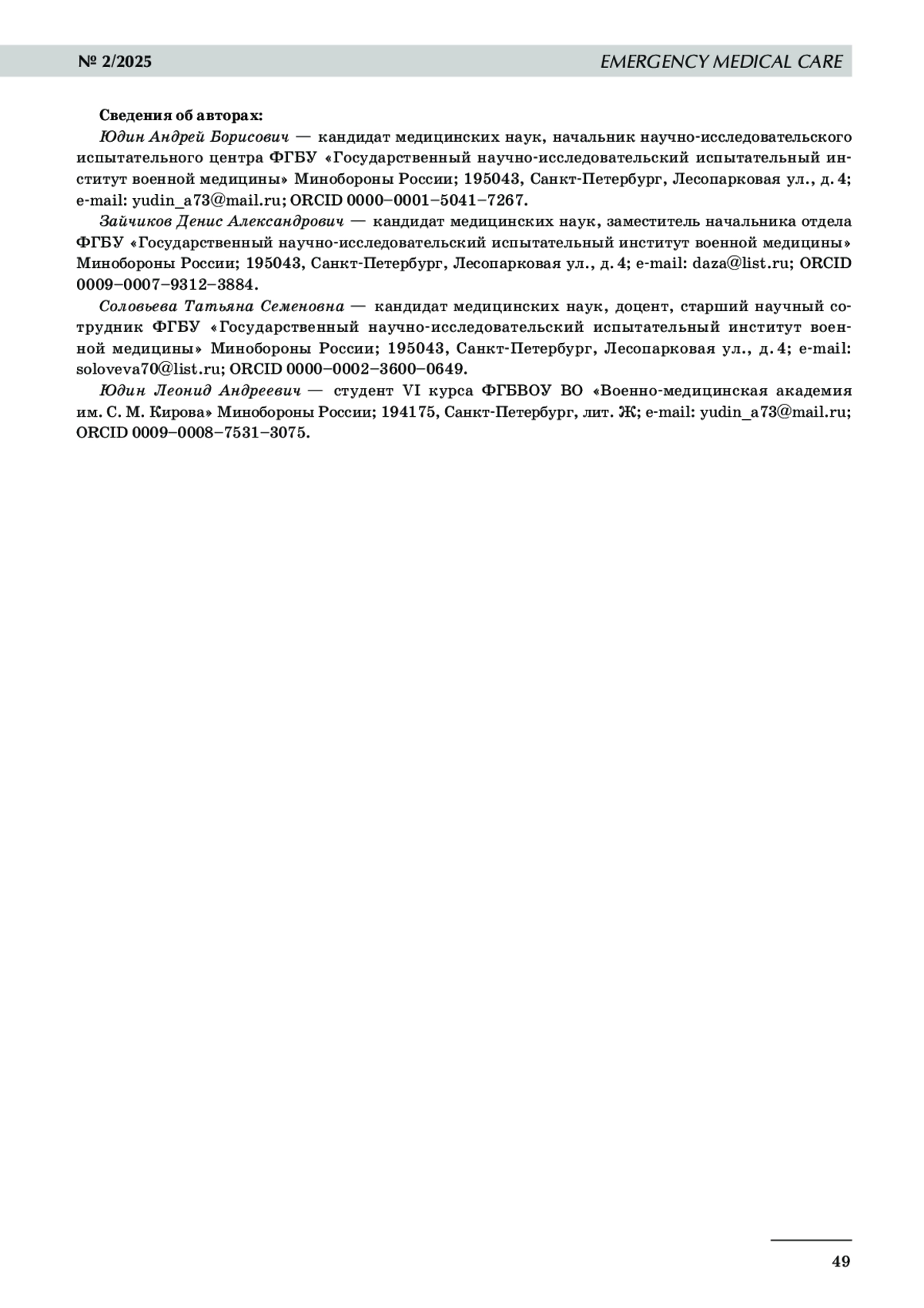 В 2025 году журналу «Скорая медицинская помощь» исполняется 25 лет. Журнал является печатным органом Российского общества скорой медицинской помощи, на страницах журнала публикуются решения Профильной комиссии Минздрава России по направлению «Скорая медицинская помощь», обсуждаются актуальные вопросы скорой медицинской помощи, службы медицины катастроф, проекты клинических рекомендаций. Цель исследования: провести анализ публикационной активности журнала за 25 лет. Материалы и методы. Анализ публикационной активности проведен по данным научной электронной библиотеки Elibrary. ru. Результаты исследования. За период с 01.01.2000 по 31.03.2025 издано 102 номера (выпуска) журнала с общим количеством статей 2344. Журнал включен в Перечень рецензируемых научных изданий, в которых должны быть опубликованы результаты диссертаций на соискание ученой степени кандидата наук и доктора наук по семи научным специальностям (категория 2). Отмечается устойчивая тенденция к увеличению числа цитирования статей, пятилетнего и двухлетнего импакт-фактора, среднего индекса Хирша авторов статей. Число цитирований в 2008 году составило 31, в 2023 году — 158; двухлетний импакт-фактор РИНЦ в 2008 году — 0,11, в 2023 году — 0,40; пятилетний импакт-фактор РИНЦ в 2008 году — 0,05, в 2023 году — 0,40; средний индекс Хирша авторов публикаций в 2008 году — 3,68, в 2023 году — 7,36. Заключение. Журнал «Скорая медицинская помощь» активно развивается и имеет потенциал для включения в Белый список научных изданий.