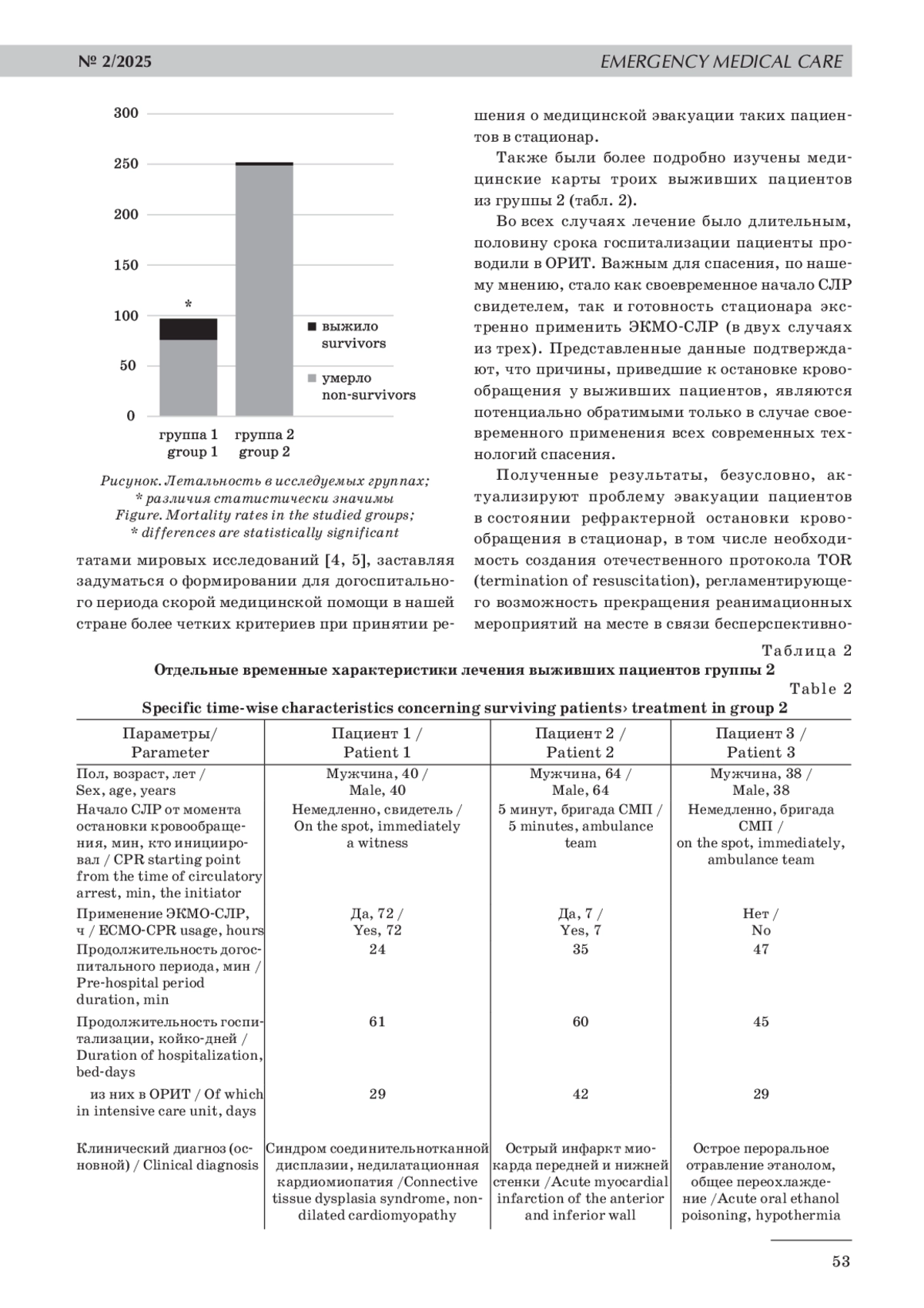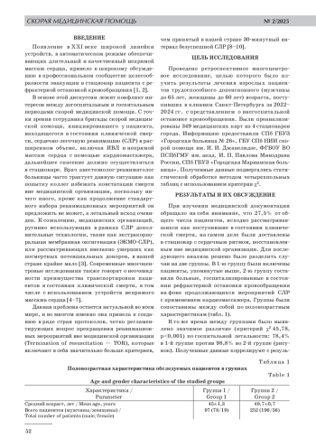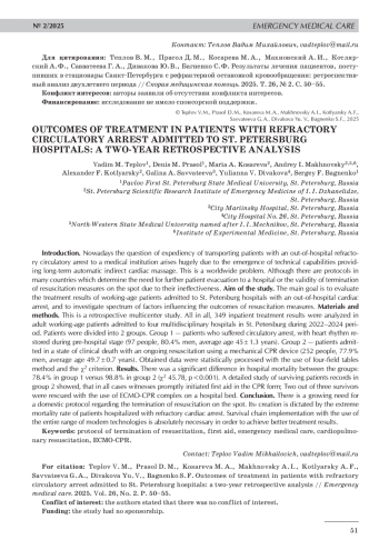 В связи с появлением технических возможностей длительно обеспечивать в автоматическом режиме непрямой массаж сердца возникает вопрос о целесообразности транспортировки в стационар пациентов с рефрактерной остановкой кровообращения вне медицинской организации. Данная проблема актуальна во всем мире, и во многих странах существуют протоколы, которые позволяют определить необходимость дальнейшей эвакуации пациента в стационар или же обоснованность прекращения реанимационных мероприятий на месте в связи с их неэффективностью. Цель исследования: оценить результаты лечения пациентов трудоспособного возраста, госпитализированных в стационары Санкт-Петербурга с представлением о внегоспитальной остановке сердечной деятельности, а также изучить факторы, влияющие на исходы реанимационных мероприятий. Материалы и методы исследования. В ретроспективном многоцентровом исследовании были проанализированы результаты стационарного лечения 349 взрослых пациентов трудоспособного возраста, поступивших в четыре многопрофильных стационара Санкт-Петербурга за 2022–2024 гг. Пациенты были разделены на две группы. Группа 1 — пациенты, перенесшие остановку кровообращения, с сердечным ритмом, восстановленным вне медицинской организации (97 человек, 80,4% мужчин, средний возраст 45±1,3 года). Группа 2 — пациенты, доставленные в состоянии клинической смерти на фоне продолжающихся реанимационных мероприятий с применением кардиомассажера (252 человека, 77,9% мужчин, средний возраст 49,7±0,7 года). Полученные данные подвергались статистической обработке методом четырехпольных таблиц с использованием критерия χ2. Результаты. Между группами было выявлено значимое различие по госпитальной летальности: 78,4% в 1‑й группе против 98,8% во 2‑й группе (критерий χ2 45,78, p<0,001). Подробное изучение медицинских карт выживших пациентов 2‑й группы показало, что во всех случаях свидетелями происшествия была своевременно инициирована первая помощь в объеме базовой СЛР, у двоих из трех выживших для спасения в стационаре применялась ЭКМО-СЛР. Заключение. Запредельный уровень летальности пациентов, госпитализированных с рефрактерной остановкой кровообращения, свидетельствует о необходимости создания отечественного протокола, регламентирующего возможность прекращения реанимационных мероприятий на месте. Для улучшения результатов лечения следует добиваться реализации цепи выживания в полном объеме с использованием всего спектра современных технологий.