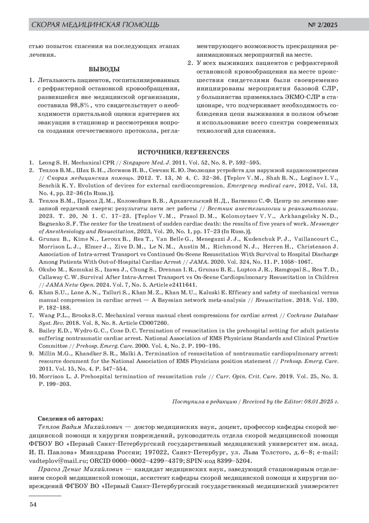 8. Bailey E.D., Wydro G. C., Cone D. C. Termination of resuscitation in the prehospital setting for adult patients suffering nontraumatic cardiac arrest. National Association of EMS Physicians Standards and Clinical Practice Committee // Prehosp. Emerg. Care. 2000. Vol. 4, No. 2. P. 190-195.