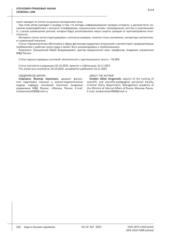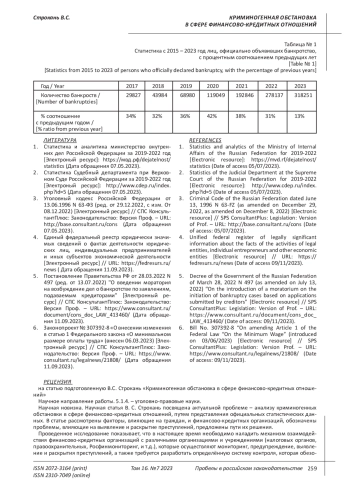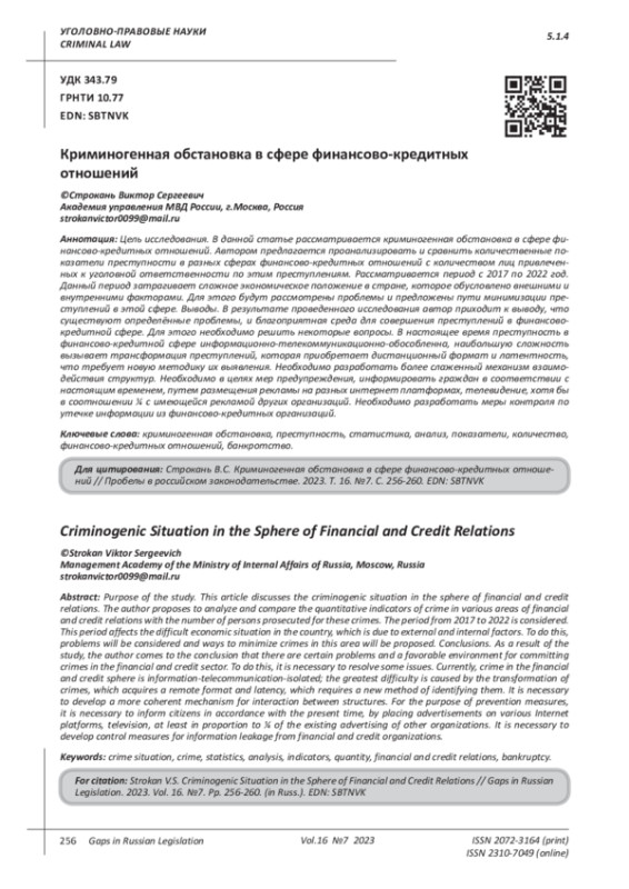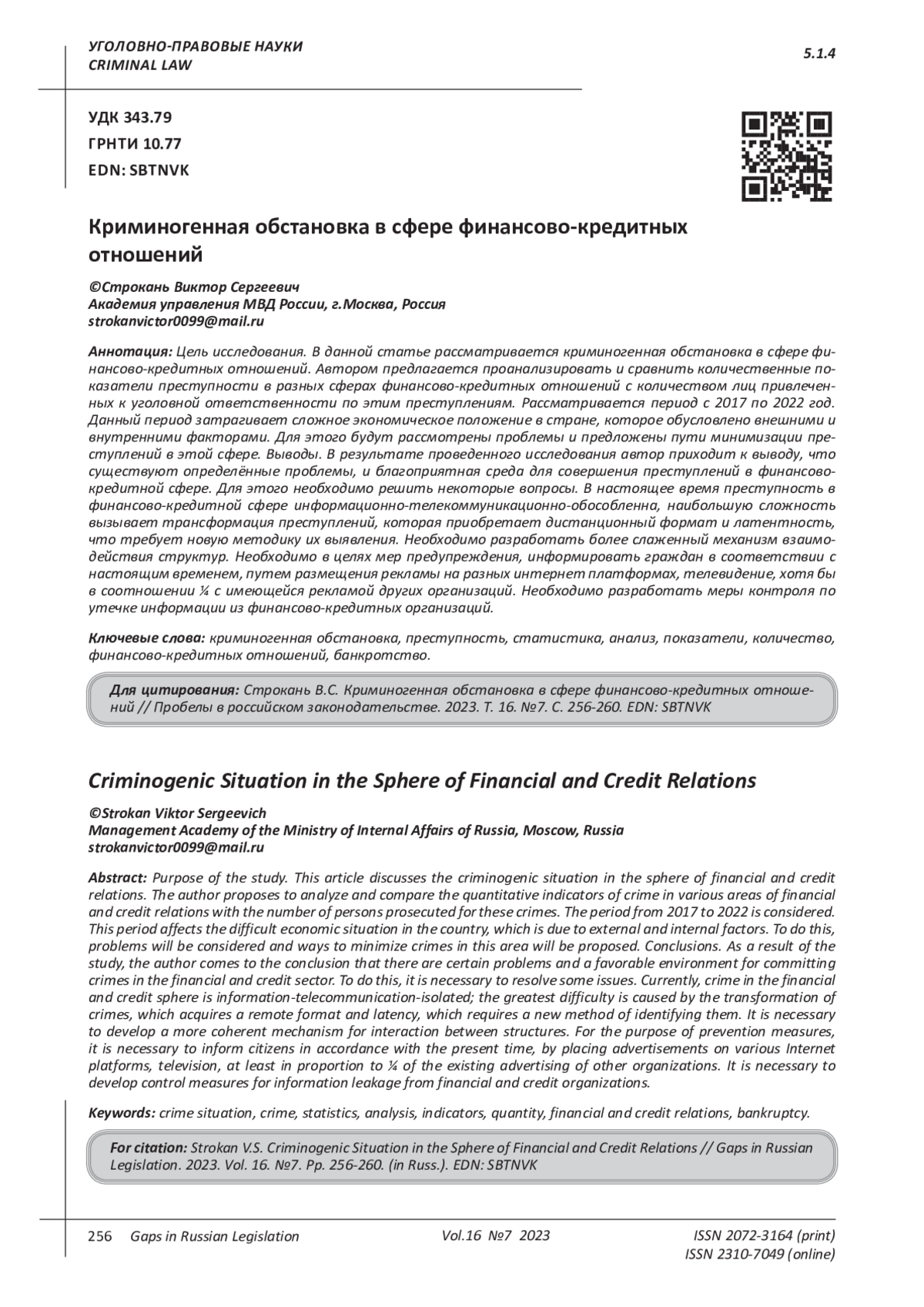 СТРОКАНЬ В. С. КРИМИНОГЕННАЯ ОБСТАНОВКА В СФЕРЕ ФИНАНСОВО-КРЕДИТНЫХ ОТНОШЕНИЙ // ПРОБЕЛЫ В РОССИЙСКОМ ЗАКОНОДАТЕЛЬСТВЕ. 2023. Т. 16 № 7 (42 СТ.)
