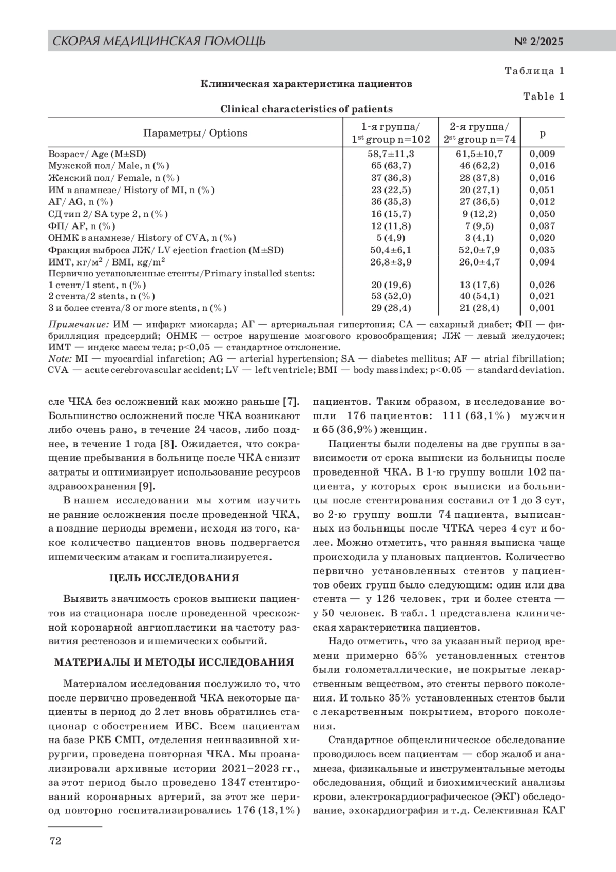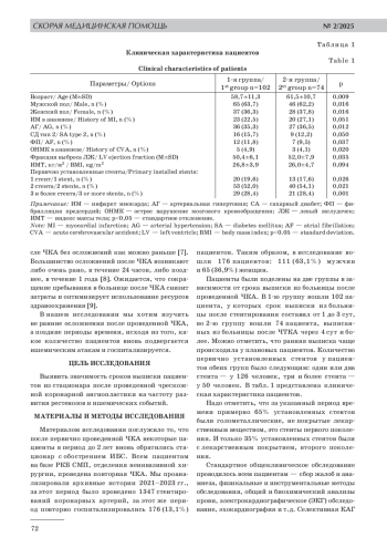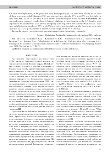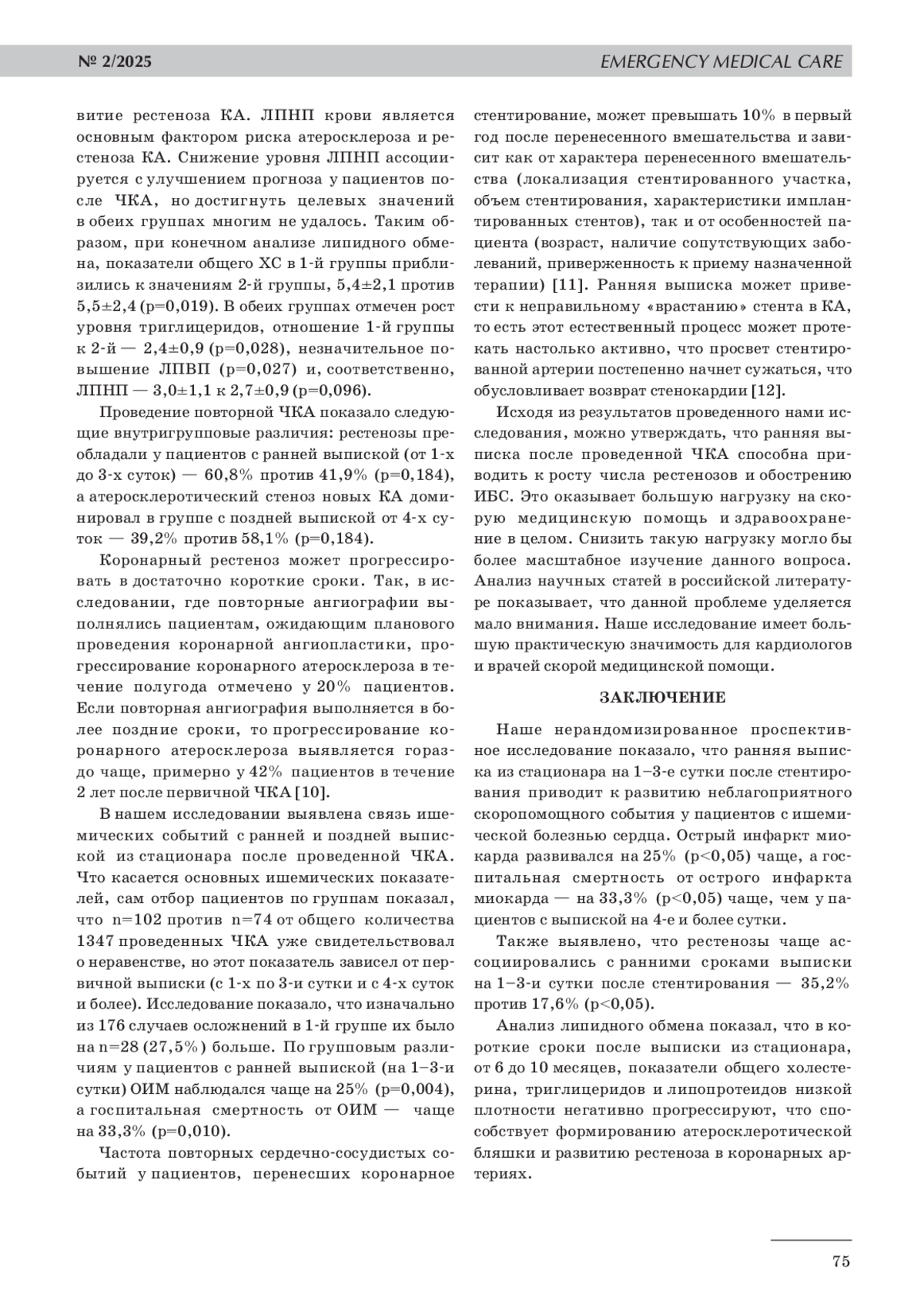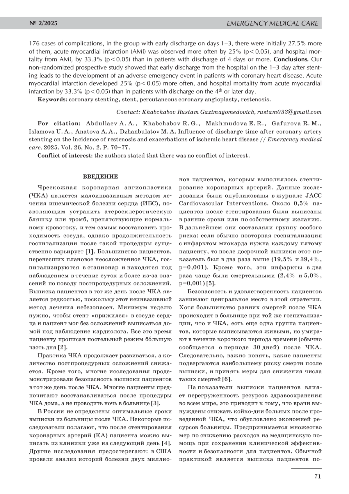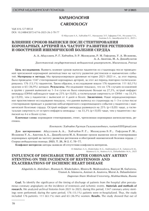 Цель исследования. Выявить влияние сроков выписки пациентов из стационара после проведенной чрескожной коронарной ангиопластики на частоту развития рестенозов и ишемических событий. Материалы и методы. Мы проанализировали архивные истории 2021–2023 гг., за этот период было проведено 1347 стентирований коронарных артерий, за этот же период повторно госпитализировались 176 (13,1%) пациентов. Таким образом, в исследование вошли 176 пациентов: 111 (63,1%) мужчин и 65 (36,9%) женщин. Результаты. Исследование показало, что из 176 случаев осложнений в группе с ранней выпиской на 1–3‑и сутки их было изначально больше на 27,5%, острый инфаркт миокарда (ОИМ) наблюдался чаще на 25% (p<0,05), а госпитальная смертность от ОИМ — на 33,3% (p<0,05), чем у пациентов с выпиской от 4 дней и более. Заключение. Наше нерандомизированное проспективное исследование показало, что ранняя выписка из стационара на 1–3‑и сутки после стентирования приводит к развитию неблагоприятного скоропомощного события у пациентов с ишемической болезнью сердца. Острый инфаркт миокарда развивался на 25% (p<0,05) чаще, а госпитальная смертность от острого инфаркта миокарда — на 33,3% (p<0,05) чаще, чем у пациентов с выпиской на 4‑е и более сутки.