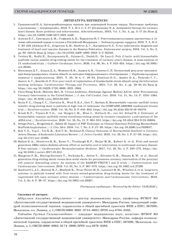 3. 	Verdoia M., Kedhi E., Suryapranata H., Galasso G., Dudek D., De Luca G. Poly (l-lactic acid) bioresorbable scaffolds versus metallic drug-eluting stents for the treatment of coronary artery disease: A meta-analysis of 11 randomized trials // Catheter Cardiovasc Interv. 2020. Vol. 96, No. 4. Р. 813-824. DOI: 10.1002/ccd.28594