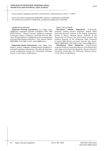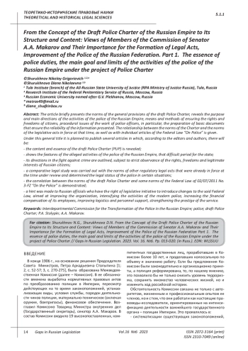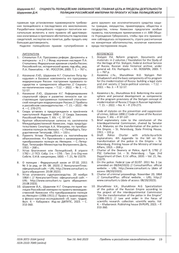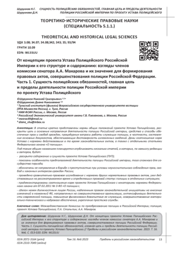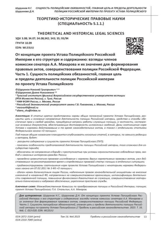 Shurukhnov V.A., Shurukhnov N.G. Specialization of the police of the Russian Empire according to the project of the interdepartmental Commission “On the transformation of the police in the Empire” (1906-1911) // Law and order in the focus of scientific research: collection. scientific works. Vol. 4. - Khabarovsk: Publishing house DVPUPS, 2023. - P. 353-360.