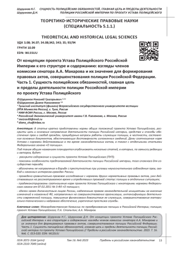 В статье кратко представлены нормы общих положений проекта Устава Полицейского, раскрыты цель и основные направления деятельности полиции Российской империи, средства и способы обеспечения прав и свобод граждан, процедурные вопросы работы служащих полиции, в частности, составление основных документов, обеспечивающих достоверность изложенных сведений. Даны соотношения норм Устава с нормами действовавших в то время законодательных актов, а также с отдельными статьями Федерального закона «О полиции». Под таким общим названием планируется опубликовать несколько статей, в которых, по замыслу редакции и авторов, будет: - раскрыто содержание и сущность проекта Устава Полицейского (ПУП); - показаны особенности предполагаемой деятельности полиции Российской империи, того сложного для государства периода; - обозначены ее направления в борьбе с преступностью при условии неукоснительного соблюдения прав, свобод и законных интересов граждан России; - проведено сравнительно-правовое исследование с нормами других нормативных правовых актов, уже действовавших на рассматриваемое время и определявших правовой статус полиции в отдельных ситуациях; - продемонстрированы соотношения норм проекта Устава Полицейского с некоторыми нормами Федерального закона от 07.02.2011 № 3-ФЗ «О полиции»; - сделан намек должностным лицам России, наделенным правом законодательной инициативы на внесение изменений в названный ФЗ, направленных на совершенствование организации, интенсификации деятельности современной полиции, повышение финансового довольствия ее служащих, совершенствование материально-технического и кадрового обеспечение, укрепление престижа службы