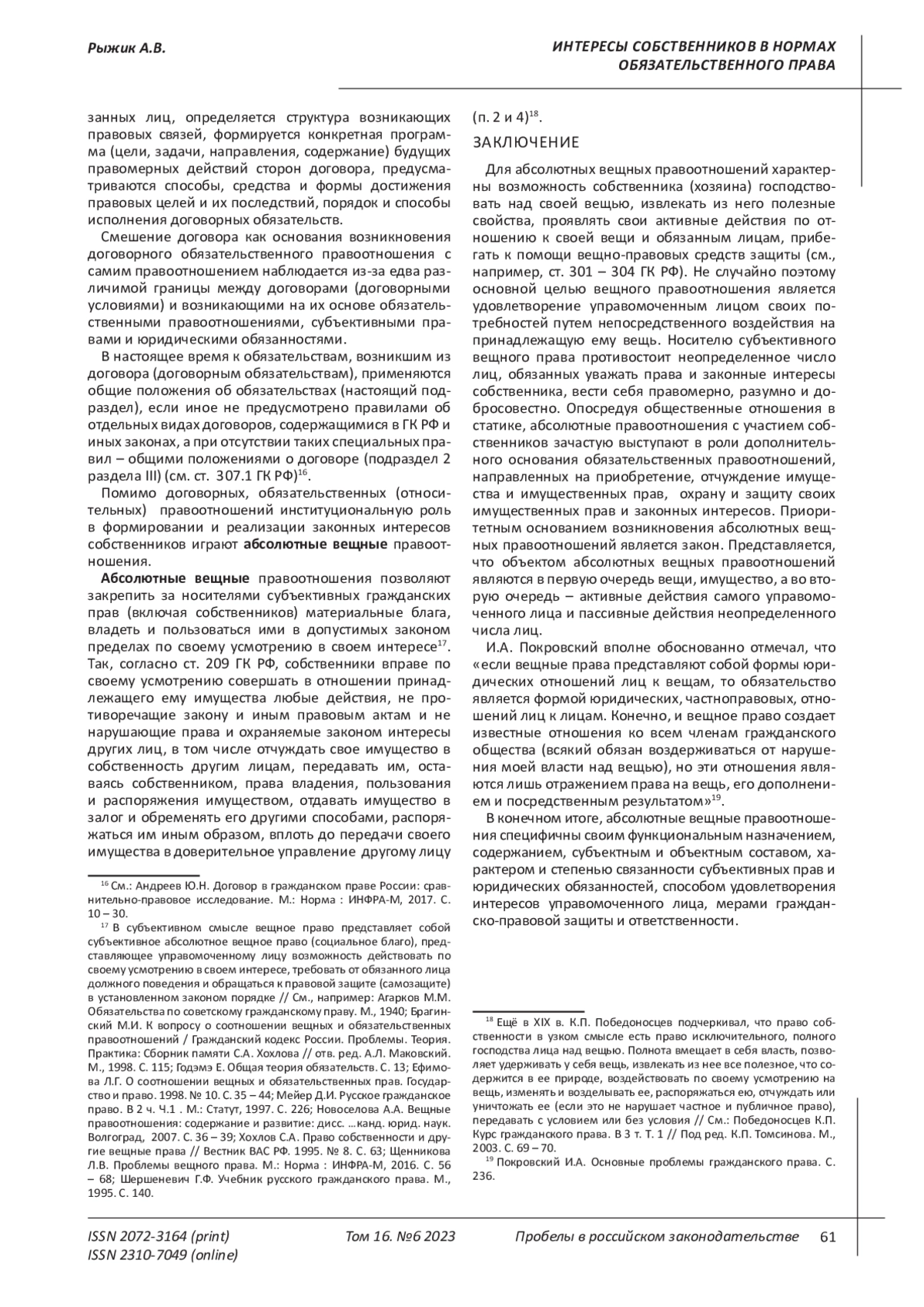 Особое место в системе гражданских правоотношений, в реализации интересов собственников занимают договорные правоотношения, т. е. правоотношения, возникающие на основе договора. Гражданско-правовой договор является легитимным средством удовлетворения позитивных интересов участников гражданских правоотношений (включая собственников), обеспечения правовой и экономической активности физических и юридических лиц, публично-правовых образований, гарантией цивилизованного разрешения возникающих конфликтов, надлежащей защитой конституционных прав и законных интересов участников имущественных отношений.