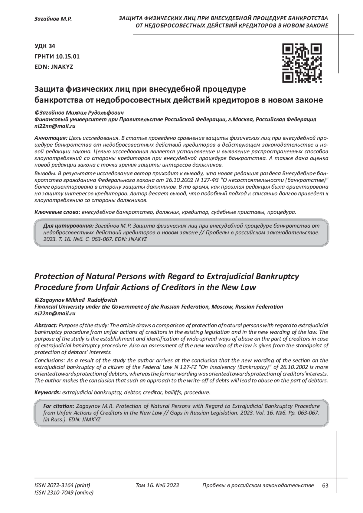 Shaikhutdinov E.M. Extrajudicial bankruptcy of a citizen: some problems of legal regulation // Economy and Law No. 8 (535) 2021 page. 84-90. [Electronic resource]. - URL: https://www.elibrary.ru/item.asp?id=46370158 (access date: 08/12/2023).