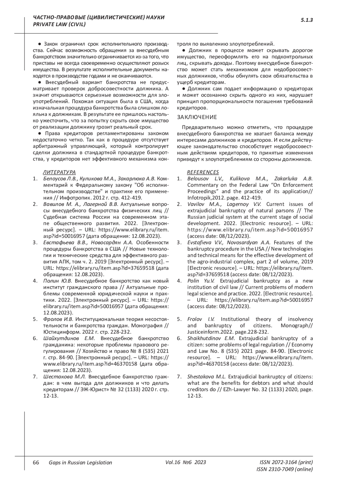 6. 	Шайхутдинов Е.М. Внесудебное банкротство гражданина: некоторые проблемы правового регулирования // Хозяйство и право № 8 (535) 2021 г. стр. 84-90. [Электронный ресурс]. - URL: item.asp?id=46370158 (дата обращения: 12.08.2023). EDN: MFIBXF