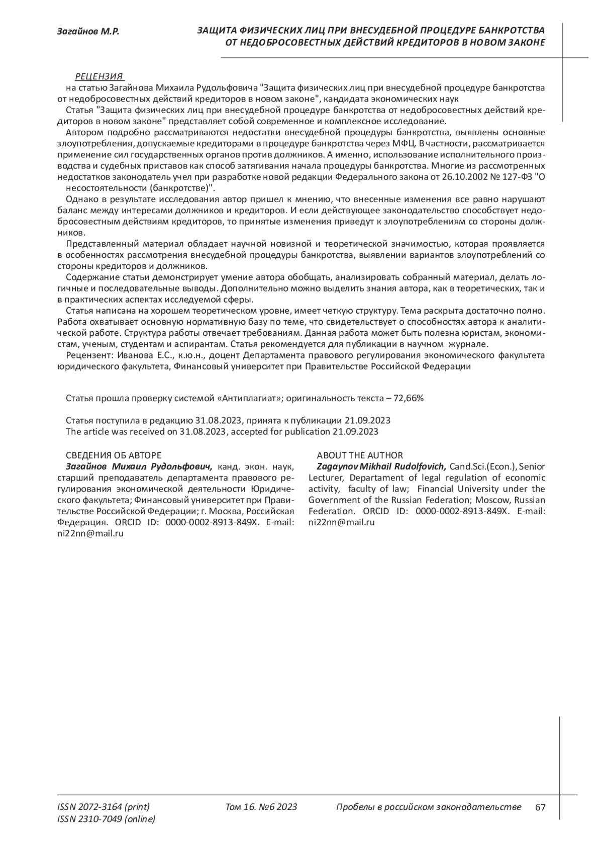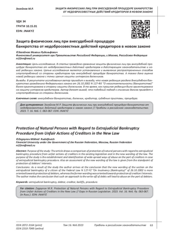 Frolov I.V. Institutional theory of insolvency and bankruptcy of citizens. Monograph//Justiceinform.2022. page.228-232.