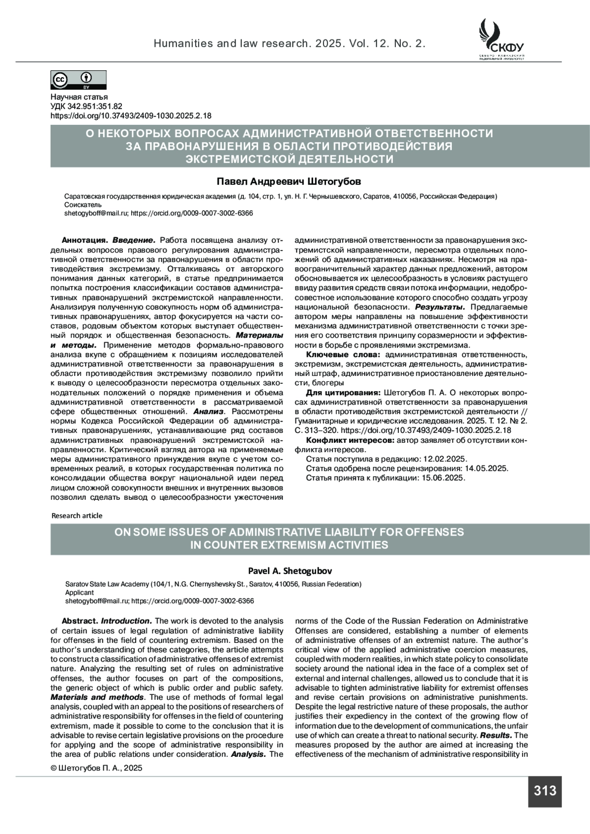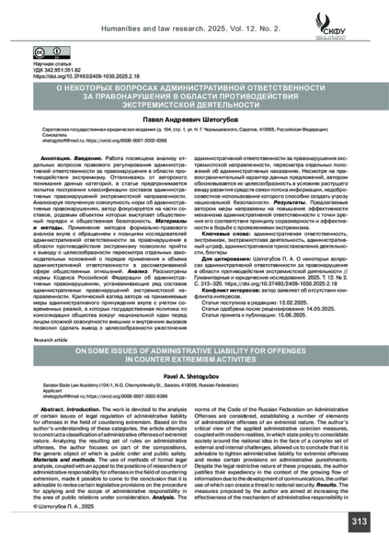 ШЕТОГУБОВ П. А. О НЕКОТОРЫХ ВОПРОСАХ АДМИНИСТРАТИВНОЙ ОТВЕТСТВЕННОСТИ ЗА ПРАВОНАРУШЕНИЯ В ОБЛАСТИ ПРОТИВОДЕЙСТВИЯ ЭКСТРЕМИСТСКОЙ ДЕЯТЕЛЬНОСТИ // ГУМАНИТАРНЫЕ И ЮРИДИЧЕСКИЕ ИССЛЕДОВАНИЯ. 2025. ТОМ 12, № 2