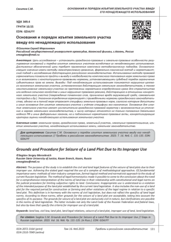 14. 	Федоскин Н.Н. Правовые аспекты изъятия земельных участков за неиспользование по целевому назначению // Modern Science. 2021. № 3-1. С. 207-209. EDN: BDPNTI