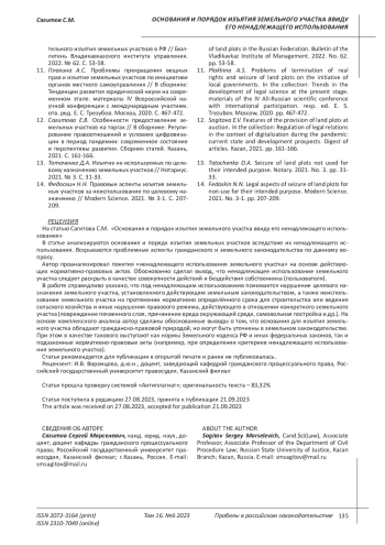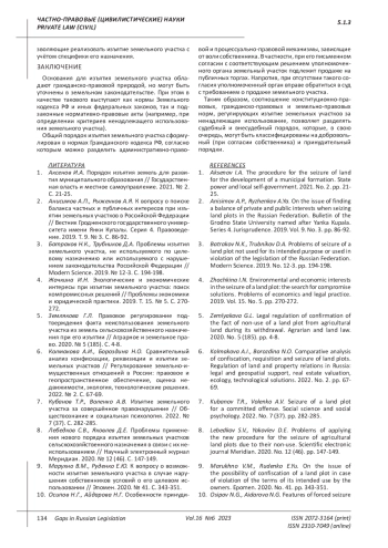 7. 	Кубанов Т.Р., Воленко А.В. Изъятие земельного участка за совершённое правонарушение // Обществознание и социальная психология. 2022. № 7 (37). С. 282-285. EDN: QUCLMC