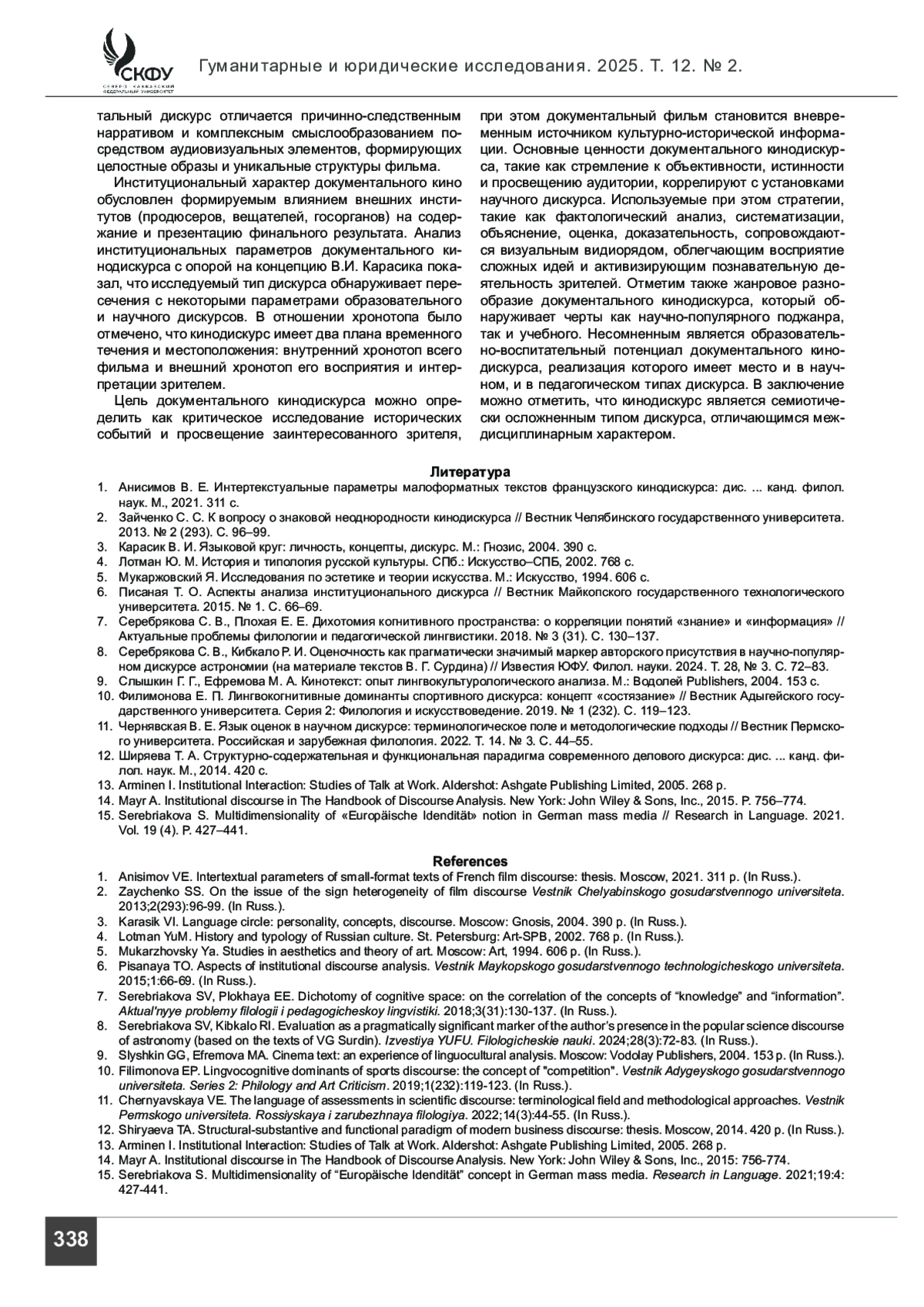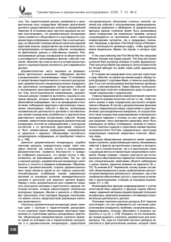 СЕРЕБРЯКОВА С. В., САЛОМАХИН А. Ю. ОСОБЕННОСТИ ИНСТИТУЦИОНАЛЬНАЛЬНЫХ ПАРАМЕТРОВ ДОКУМЕНТАЛЬНОГО КИНОДИСКУРСА // ГУМАНИТАРНЫЕ И ЮРИДИЧЕСКИЕ ИССЛЕДОВАНИЯ. 2025. ТОМ 12, № 2