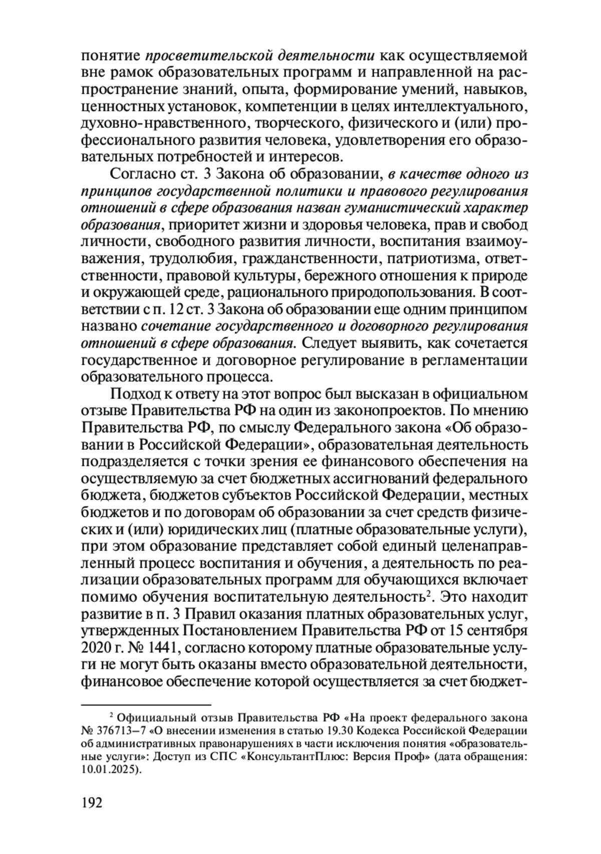 Образование неразрывно соединяет в себе процессы воспитания и обучения. Следует критически оценить возможность квалификации всех образовательных отношений только как отношений по оказанию образовательных услуг. Образование представляет собой трехкомпонентный процесс, включающий обучение, воспитание и государственную итоговую аттестацию. В образовательном процессе можно выделить следующие элементы: 1) частноправовой, состоящий в услуге по обучению, предоставляемой обучающемуся; 2) административно-правовой, состоящий в проведении государственной итоговой аттестации и выдаче документа, подтверждающего наличие у лица образования и квалификации соответствующего уровня; 3) публично-правовой, когда в процессе образования осуществляется воспитание обучающихся, формирование их личности. Следует различать процессы обучения и образования: обучение является частью образовательного процесса и представляет собой гражданское правоотношение, предметом которого является создание обучающимся условий для освоения образовательных программ, возникающее на основании не только лишь распорядительного акта образовательной организации, а также и волеизъявления обучающегося. Образование является сложным, комплексным процессом, включающим в себя помимо гражданских и административных правоотношений между образовательной организацией и обучающимся также и государственный элемент, заключающийся в необходимости воспитания и формирования личности на принципах гуманизма, патриотизма, гражданственности, бережного отношения к окружающей среде, уважения традиционных ценностей.