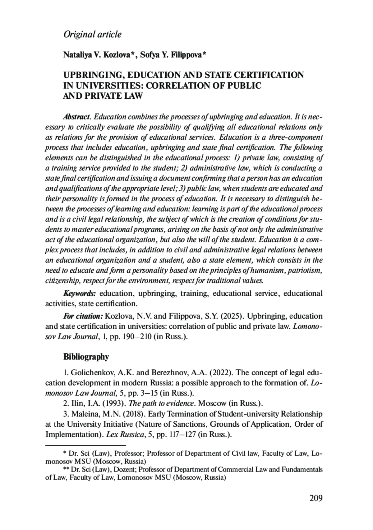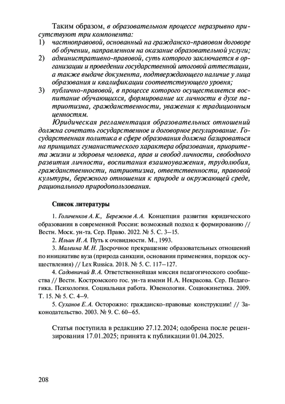 1. Голиченков А. К., Бережнов А. А. Концепция развития юридического об ра зования в современной России: возможный подход к формированию // Вестн. Моск. ун-та. Сер. Право. 2022. № 5. С. 3-15.