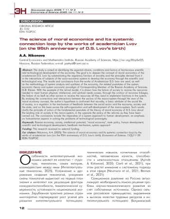 Исследование направлено на выявление сущностных драйверов, условий и факторов гармоничного научно-технологического развития экономики. Цель – углубление концепта нравственной экономики академика РАН Д. С. Львова за счет обоснования регуляторной функции нравственности и производных от нее принципов во взаимодействиях субъектов социально-экономической системы в контексте развития экономики научно-технологическим путем. Использованы результаты и выводы трудов Львова, а также методология системного анализа и синтеза экономики, связанные с ней постулаты системной экономической теории и системной экономической парадигмы члена-корреспондента РАН Г. Б. Клейнера. На примере модели тетрады макросистемы показано, каким образом нехватка обществом ресурсов, необходимых для удовлетворения физических, интеллектуальных, духовных потребностей человека приводит через контур рекурсивных связей к нехватке у самого общества и у других секторов ресурсов, нужных для реализации их функций в системе. В результате изучения связей и взаимодействий между секторами макросистемы с точки зрения концепта нравственной экономики подтверждается гипотеза автора о том, что нравственность, являясь базовым атрибутом социальной жизни общества, выступает регулятором в механизме обратной связи между социальной сферой и экономикой, социумом и государством и на этой основе обеспечивает самоорганизацию и саморазвитие целостной макросистемы. Полученные результаты уточняют принцип действия основополагающего постулата львовской науки нравственной экономики о ведущей роли социума, средового сектора макросистемы, в противовес политике проводимых реформ. Выводы касаются проблем системного подхода к развитию человека, акцентируют внимание на гуманитарных аспектах при решении проблем технологического суверенитета.